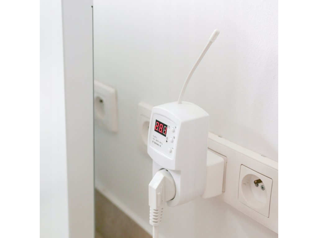 Wygodne podłączenie: wystarczy, że podłączysz termostat do gniazdka, a panel grzewczy podłączysz do termostatu. System będzie utrzymywał temperaturę ustawioną w zakresie od 5 do 35 °C i zapewni dodatkowe oszczędzanie energii elektrycznej.