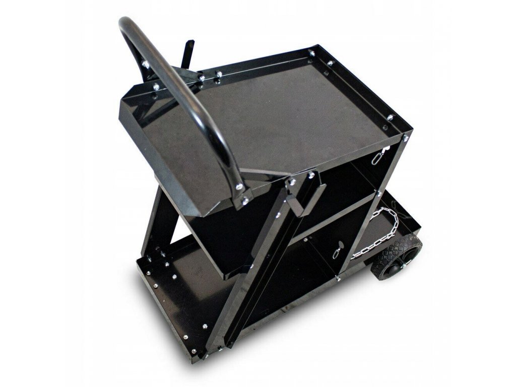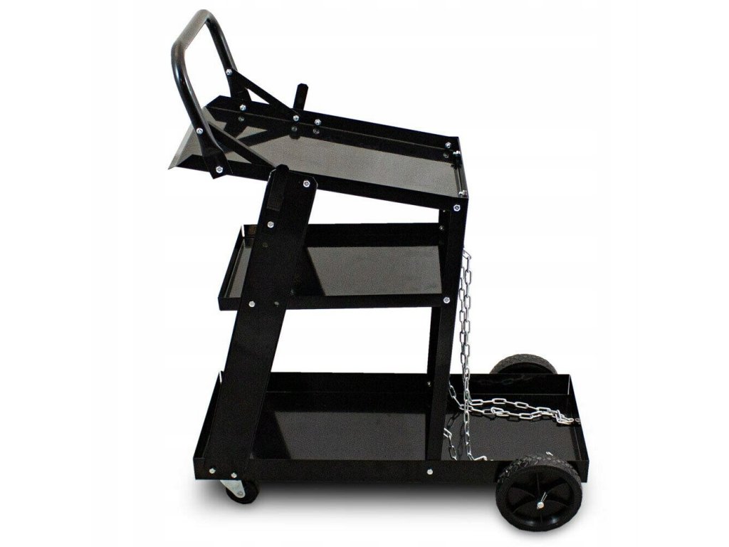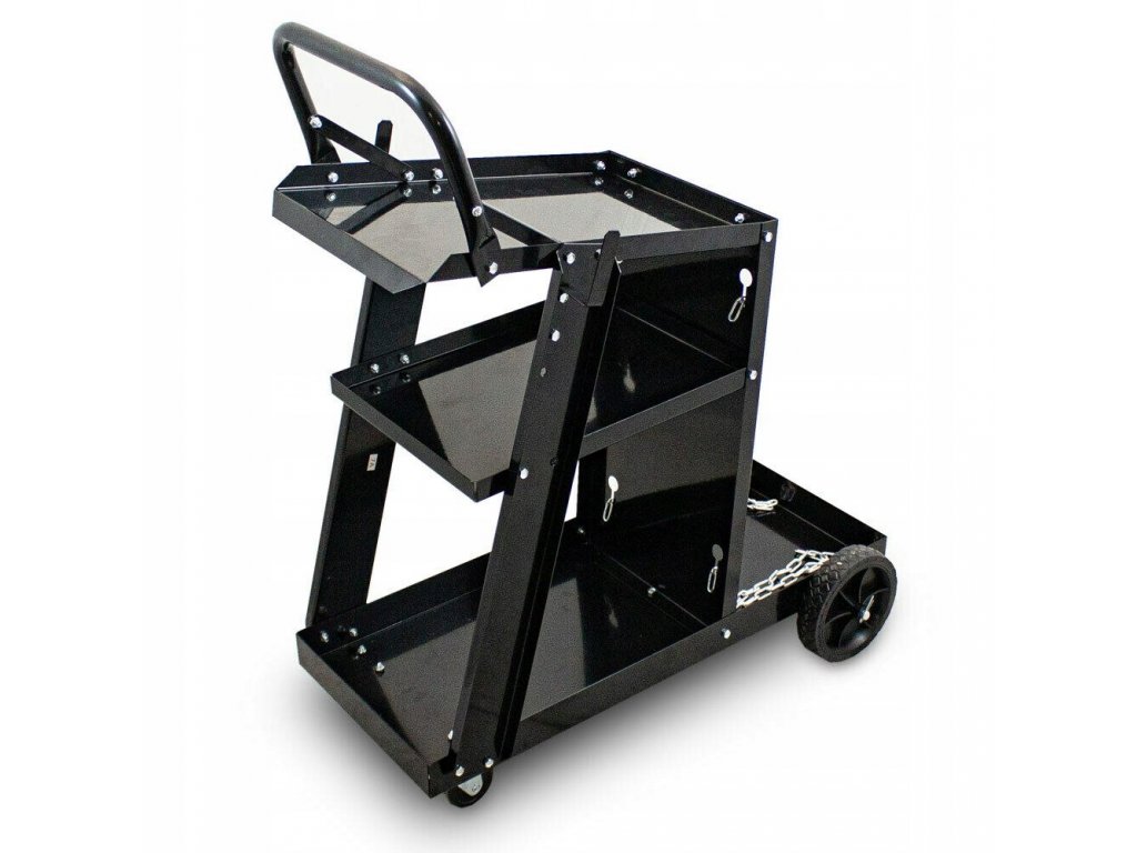 Solidny i stabilny wózek spawalniczy doskonale nadaje się do transportu urządzeń spawalniczych, butli gazowych, falowników i innych akcesoriów. 3 półki zapewniają wystarczająco dużo miejsca do przechowywania wszystkich niezbędnych przy wykonywanej pracy narzędzi. Butlę z gazem można umieścić z przodu wózka oraz zabezpieczyć dwoma łańcuchami. Komfort transportu wózka oraz zwrotność zapewniają 2 duże koła oraz 2 kółka skrętne. Wózek wykonany z wysokiej jakości stali przeznaczony jest do udźwigu maksymalnego 40kg.