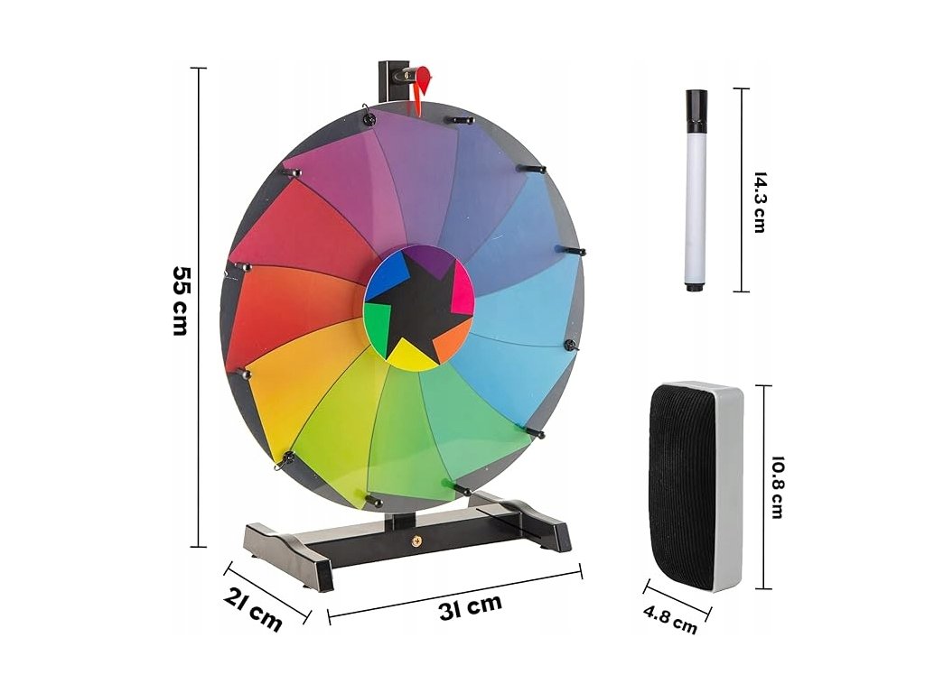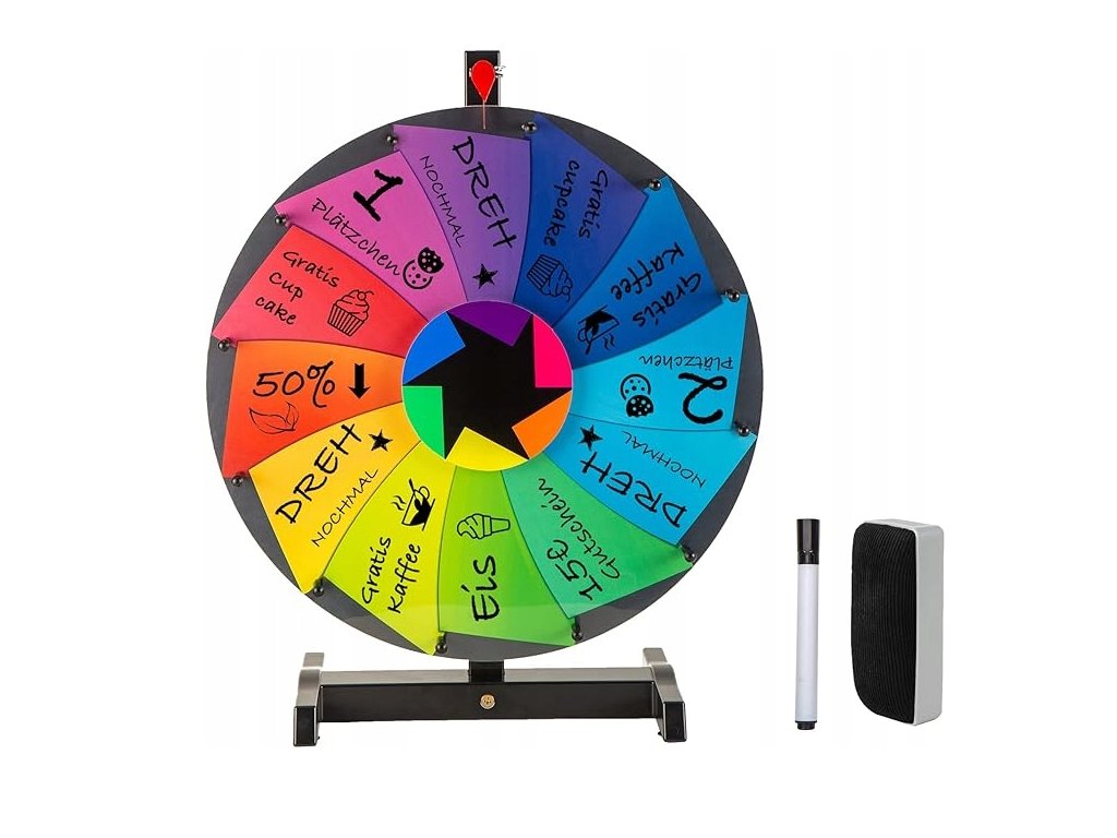 • Pevná konštrukcia: Robustný kovový stojan drží všetko pohromade, ideálny pre každú príležitosť. Či už na svadbe, firemnej akcii alebo doma, naše koleso šťastia zaistí správnu odbočku.