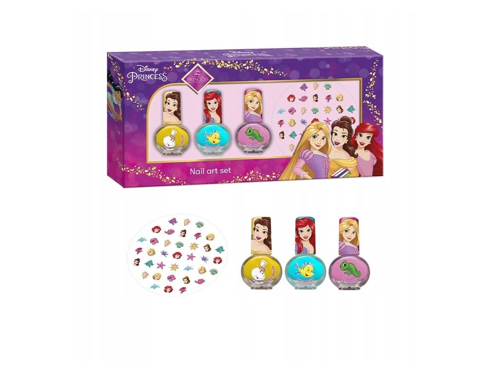 Sada na detskú manikúru, ktorá obsahuje 3 vodou riediteľné laky na nechty v ružovej, žltej a svetlomodrej farbe a tiež nálepky disney princeznej.