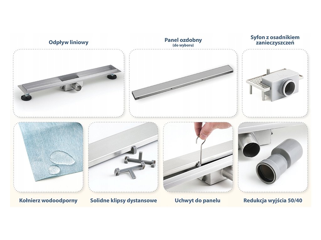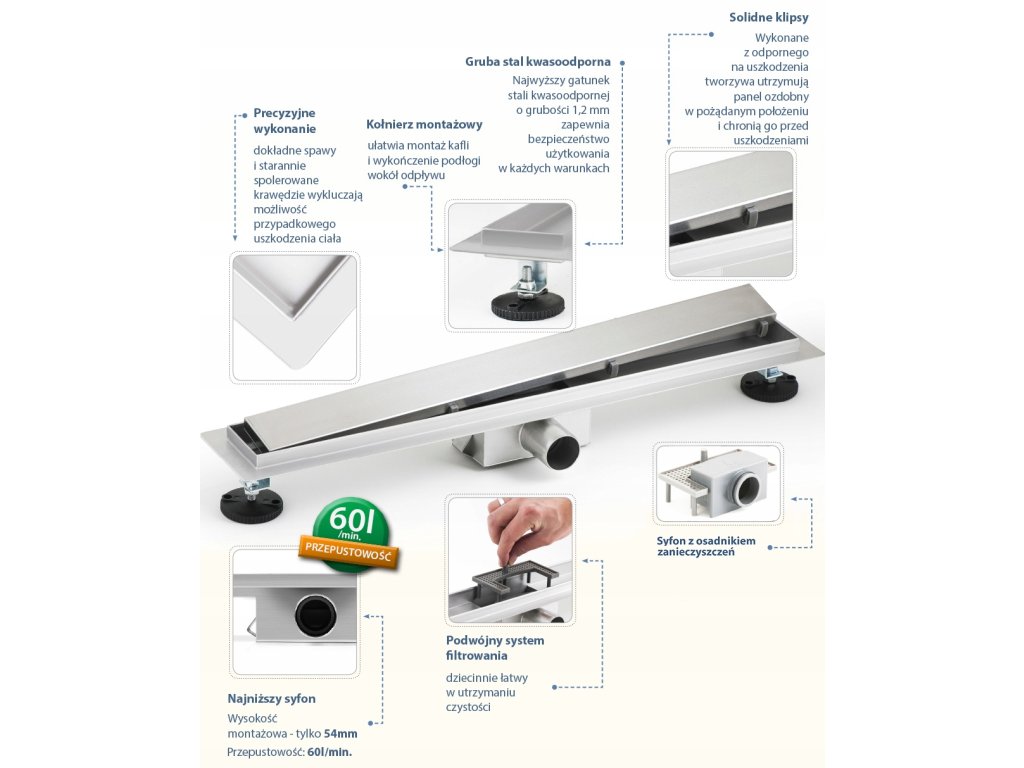 Oferujemy do sprzedaży wysokiej jakości odpływ liniowy polskiego producenta. Wydajny system odpływowy o przepustowości do 1 litra na sekundę, gwarantuje szybkie odprowadzanie wody z posadzki. Odpływ wyposażony jest również w podwójny system filtrujący który zapobiega zatykaniu odpływu, a odpowiednio ukształtowany syfon eliminuje brzydkie zapachy z kanalizacji.