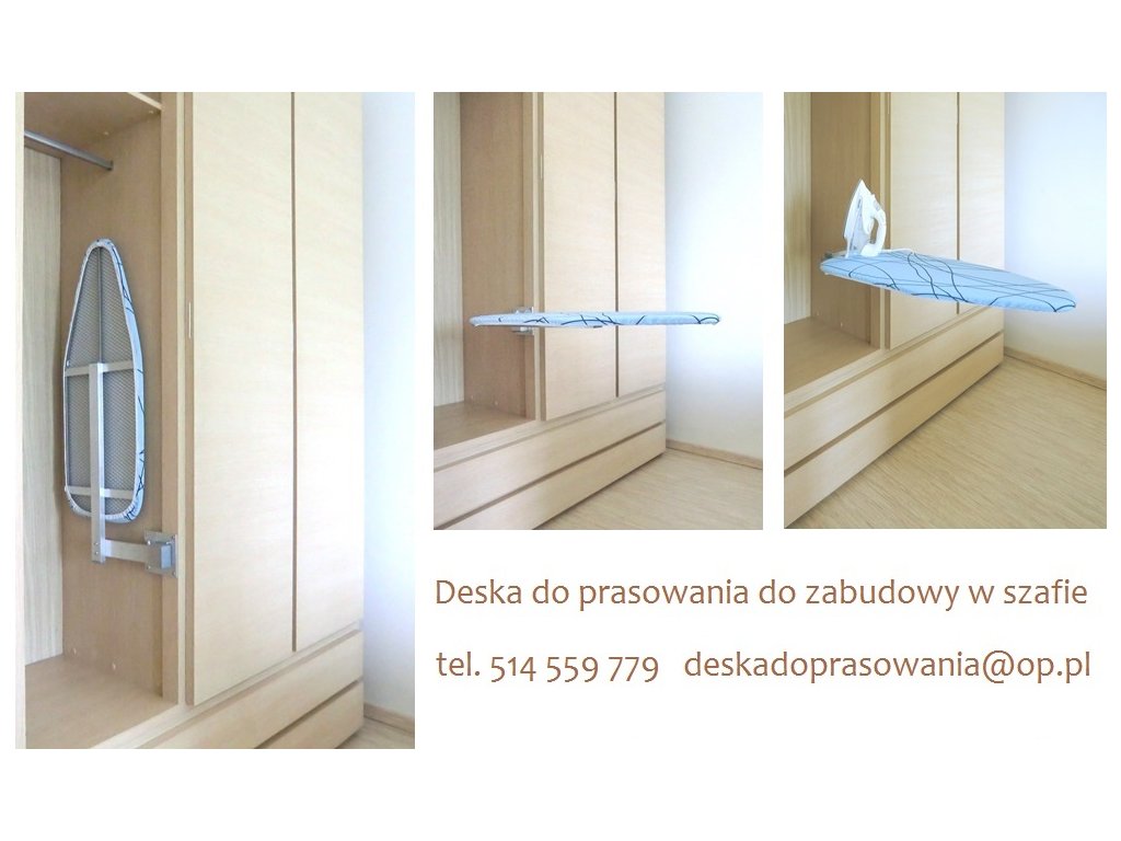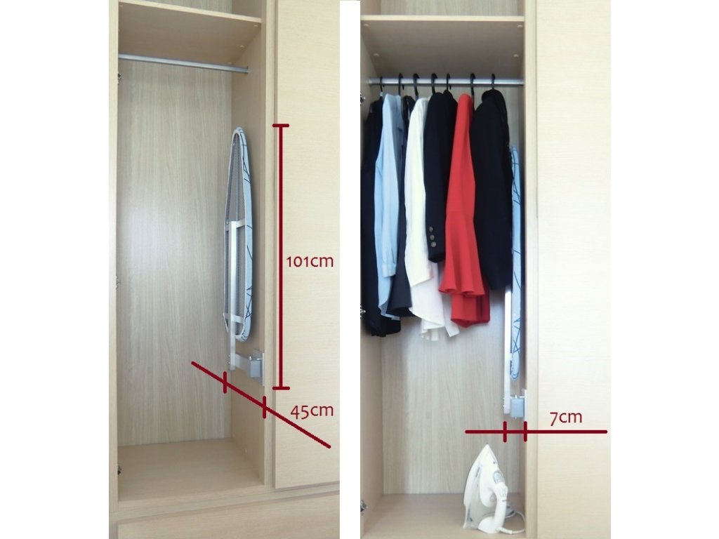 NOVINKA Žehliaca doska pre vstavanú skriňu alebo šatník. Mechanizmus umožňuje rýchle rozloženie a zloženie dosky. Rozkladá sa hladko a potichu. Keď je doska zložená do šatníka, zaberá málo miesta. Rameno mechanizmu, na ktorom spočíva doska dosky, je veľmi stabilné.