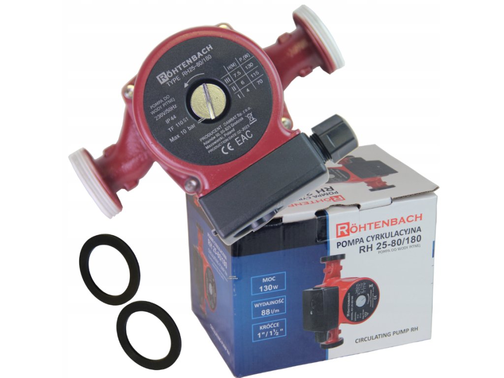 Obehové čerpadlo  RH 25-80/180 RÖHTENBACH je čerpadlo na nútený obeh vody v systémoch ústredného kúrenia. Rafinovaný dizajn robí lodičky veľmi obľúbenými. Teleso čerpadla je vyrobené z liatiny, spojovacie skrutky sú štandardné, čo znamená, že čerpadlo pasuje na miesto takmer akéhokoľvek iného čerpadla.