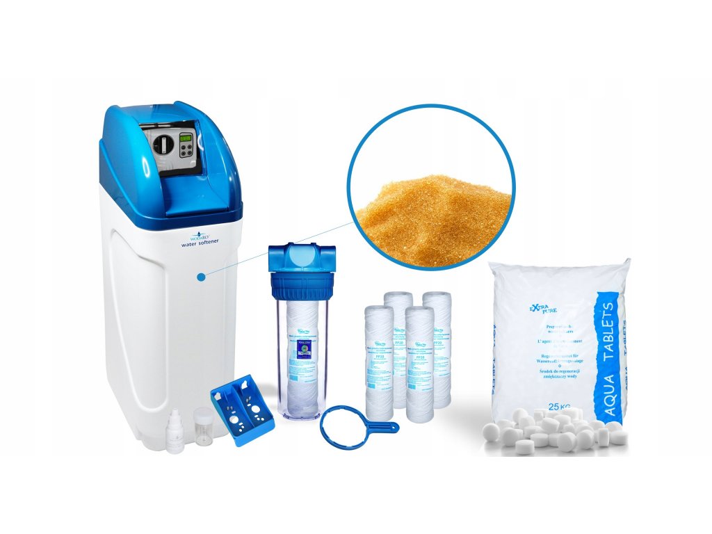 Po prechode cez usadeninu uhlia sa voda dostane do kontaktu s zmäkčovacím lôžkom. V tomto štádiu sa ióny vápnika a horčíka vymieňajú za jód sodný. Dokonale dechlorovaná, bezpečná a mäkká voda sa vypúšťa do vodného systému. Ióny "tvrdosti" (vápnik a horčík) sa vylučujú do kanalizačného systému počas regeneračného procesu zariadenia.