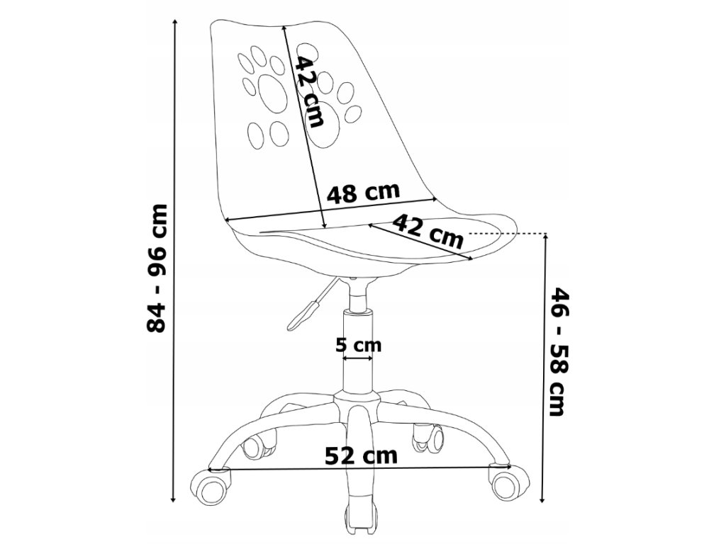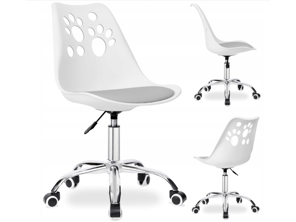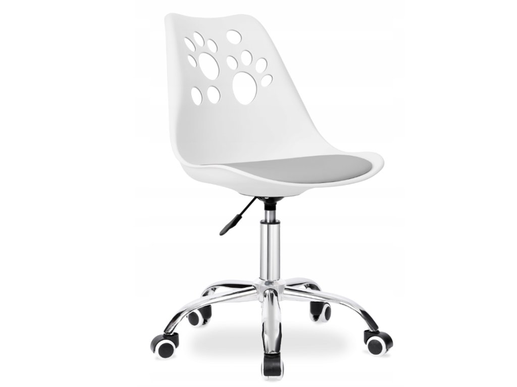 Detská stolička Grover od eHokery je pevná kancelárska stolička s plynulým výškovým nastavením. Vyrobené z odolného PP materiálu, ekokože a chrómovaného rámu . Kancelárske kreslo Grover sa vyznačuje tvarovaným, ergonomickým sedadlom s mäkkým a pohodlným vankúšom z ekokože . Operadlo zdobí zaujímavý vzor mačacích labiek . Kreslo je pohodlné a pohodlné na používanie. Je stabilný , plne otočný a tichý vďaka gumeným kolieskam . Zaujímavý dizajn a pastelové farby skvele zapadnú do každej detskej izbičky.