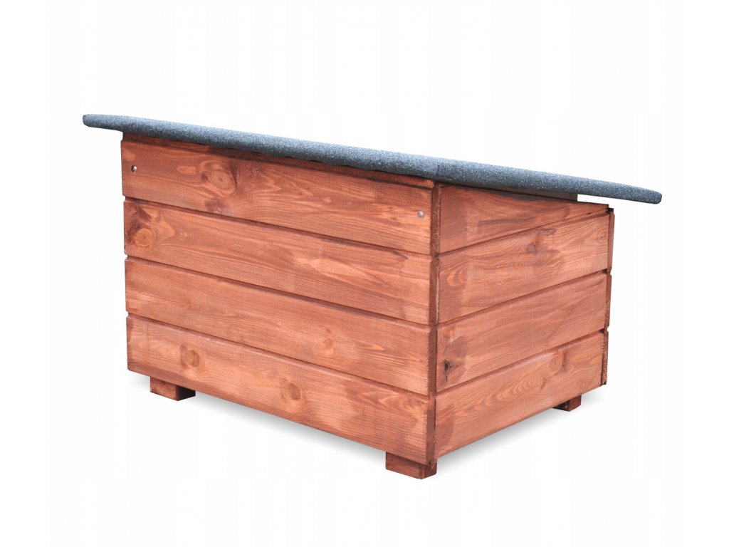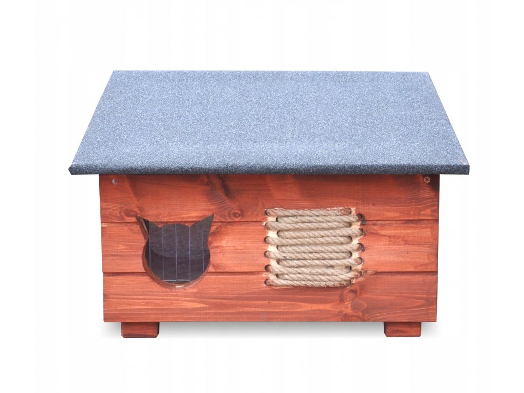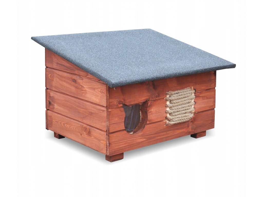 Drewniana budka dla kota wykona z drewna sosnowego. Domek jest ocieplany, także dach i podłoga 2cm warstwą styropianu.