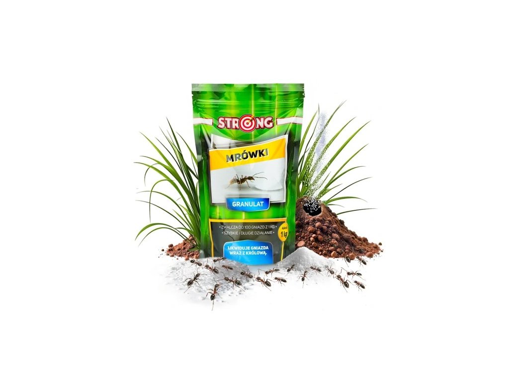 STRONG FOR ANTS  je účinný insekticíd, ktorý bojuje proti rôznym druhom mravcov, ako sú napríklad mravec obyčajný, mravec kartónový alebo faraónsky mravec. Granulát je pripravený na okamžité použitie a používa sa na pokrytie chodníkov, po ktorých sa mravce pohybujú. Prípravok na ničenie mravcov sa môže  rozptýliť okolo kvetov a ovocných kríkov , čo môže pomôcť chrániť rastliny. Cypermetrín obsiahnutý v granuláte je účinná látka, ktorá pôsobí cez žalúdok a pri kontakte vedie k paralýze a nakoniec k smrti.