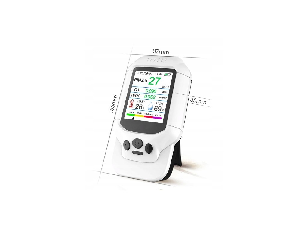 Tento produkt je multifunkčný detektor kvality ovzdušia, ktorý dokáže detekovať prchavé organické zlúčeniny, častice <2,5 mikrónu (pm2,5/1,0/10), teplotu a vlhkosť, hodiny a funkcie záznamu.