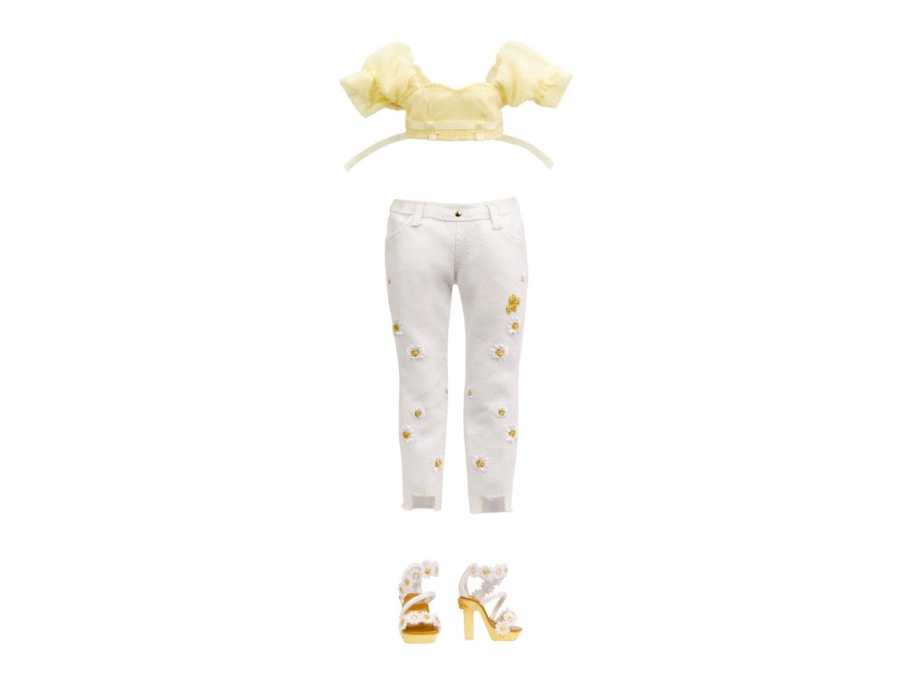 Okrem toho súprava obsahuje doplnkovú sadu oblečenia: biele nohavice, žltú blúzku s volánmi a sedmokrásky.