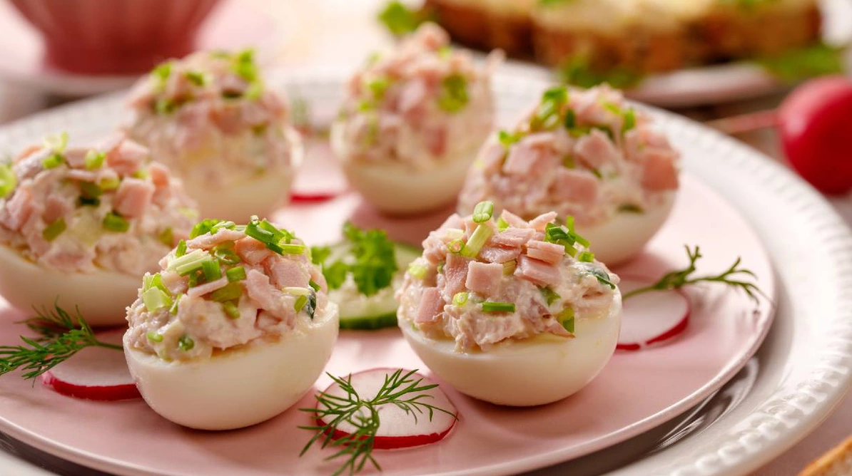 5. Vajcia plnené šunkou, nakladanou uhorkou a reďkovkou