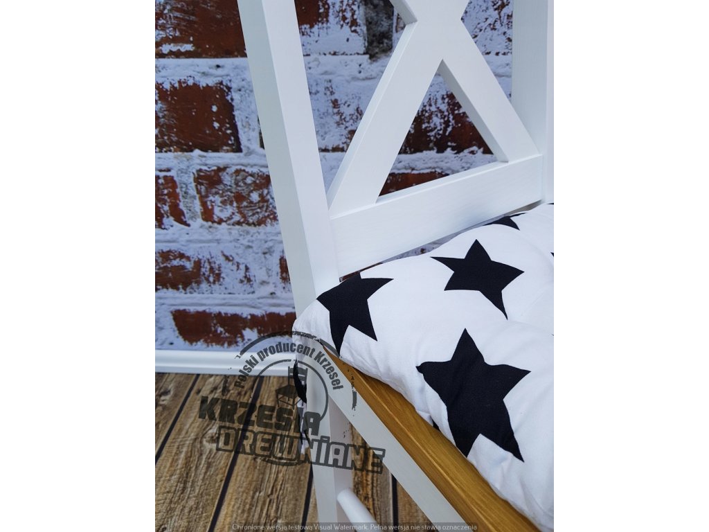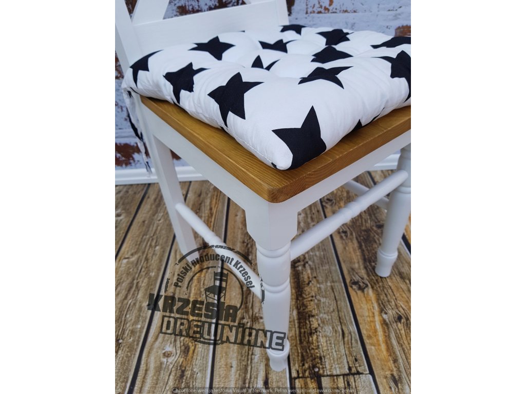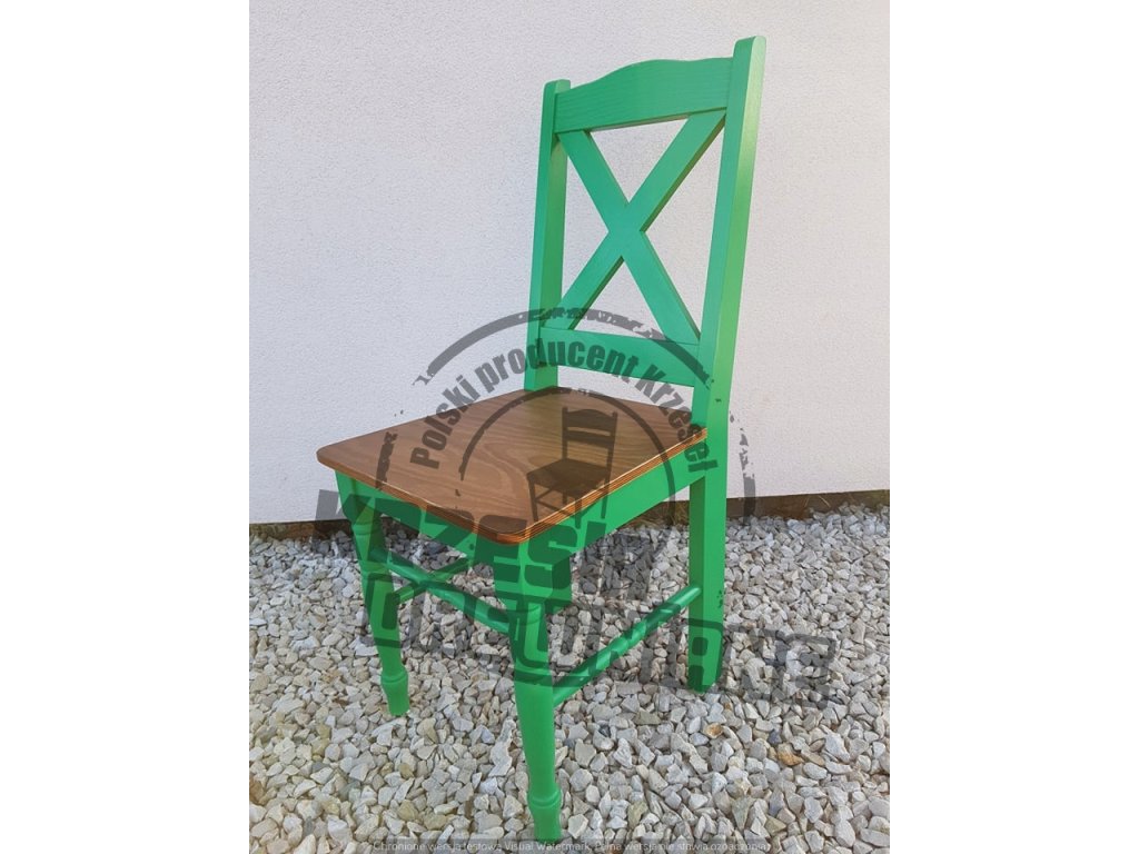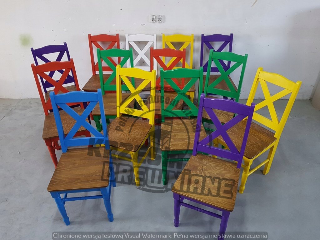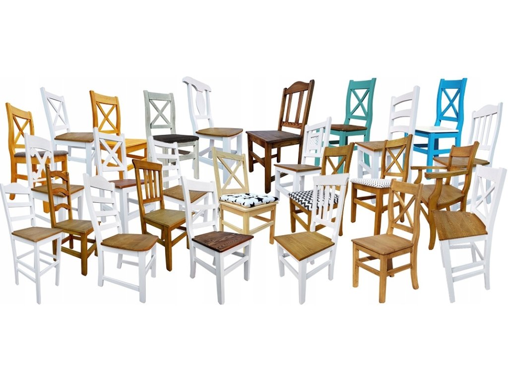 Wszystkie krzesła są wykonane z dobrej jakości drewna Sosnowego. Standardowe wybarwienie krzeseł jest w kolorze wosku Miodowego, natomiast każdy inny kolor można wybrać z gamy kolorów RAL jaką dysponujemy bądź zasugerować własną kolorystykę.