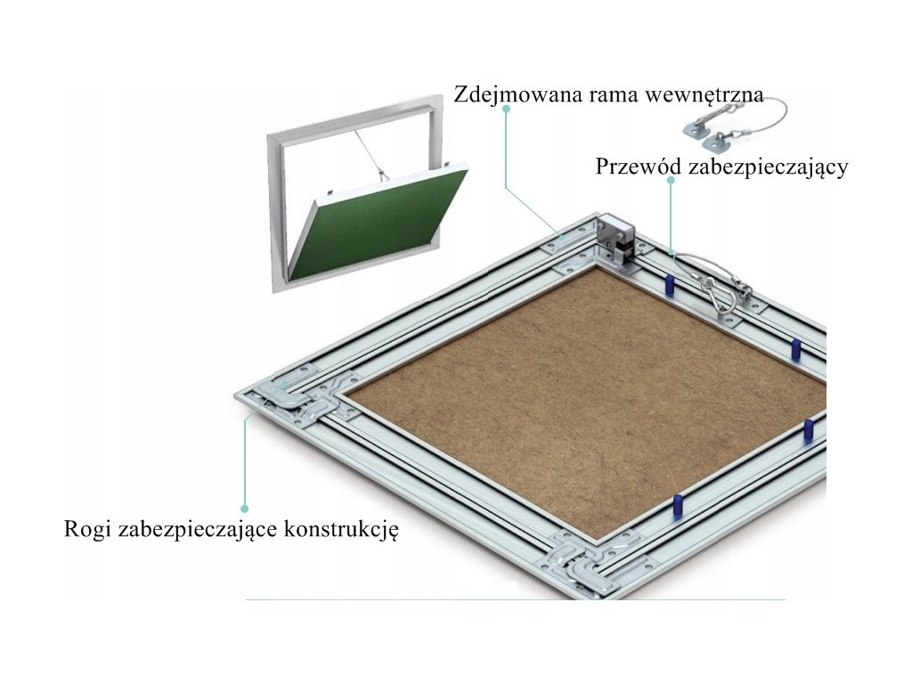 Klapa rewizyjna wykonana z aluminium i wodoodpornej płyty karton-gips, wyposażona w dwa zamki zapadkowe.