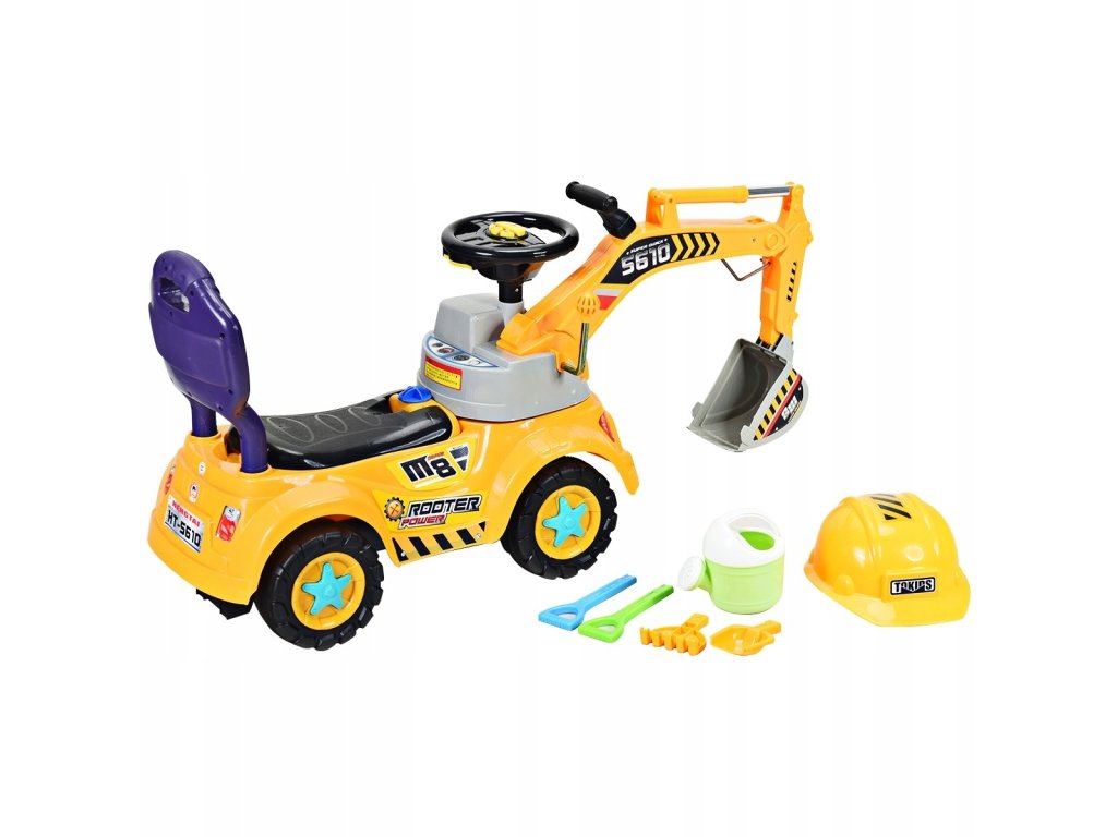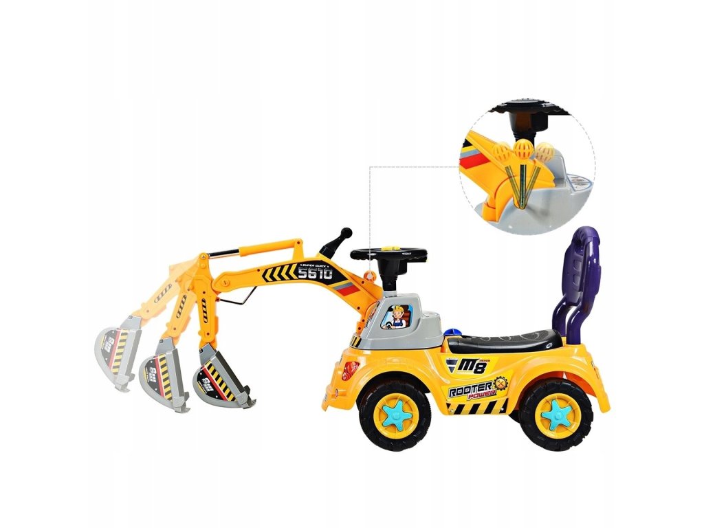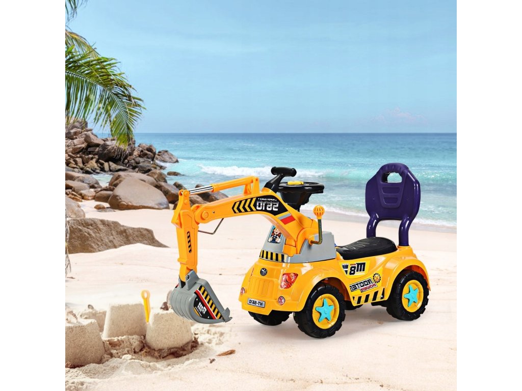 Unikalny design - koparka została zaprojektowana tak, by naśladować prawdziwą maszynę! W projekcie zostało uwzględnione w ruchome ramię, podświetlana kierownica oraz ukryty pod siedzeniem schowek. Do zestawu został również dołączony kask oraz 3 plażowe zabawki
