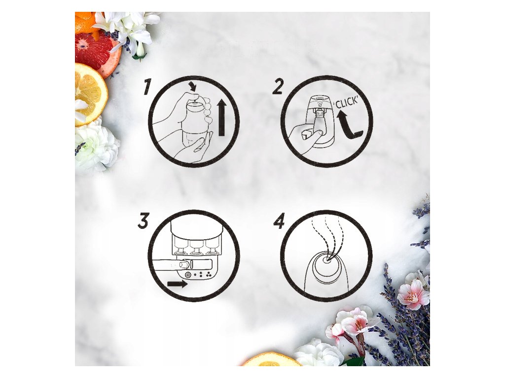 Vychutnajte si skutočnú vôňu prírodného osvieženia a vychutnajte si citrónovú hmlu doplnenú bylinkovým tónom aromatického tymiánu. Nový, funkčný produkt transformuje arómu esenciálnymi olejmi na voňavú hmlu, ktorá vznáša vo vzduchu a poskytuje trvalý osviežujúci účinok. Jedna náplň trvá až 45 dní. *