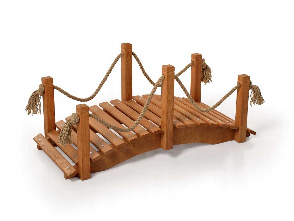 Mostek drewniany wykonany z drewna sosnowego zaimpregnowany w kolorze tik przeznaczony do ozdoby ogrodu.