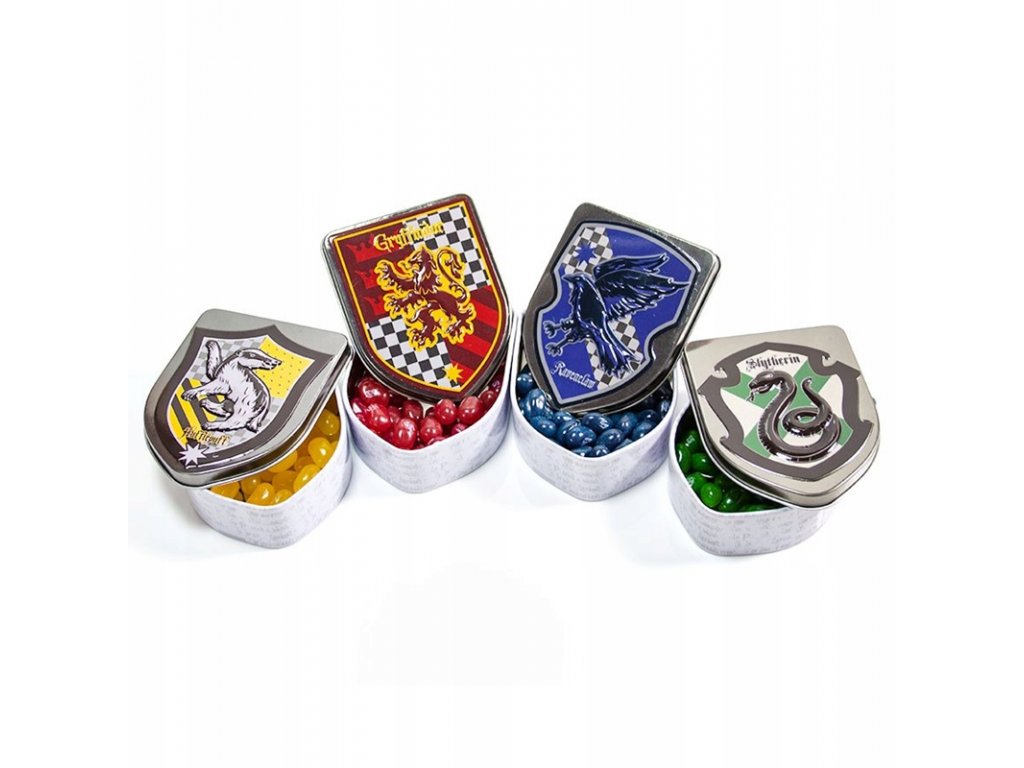 Pyszne owocowe fasolki w czterech metalowych puszkach na których znajdują się cztery godła szkół Hogwartu.