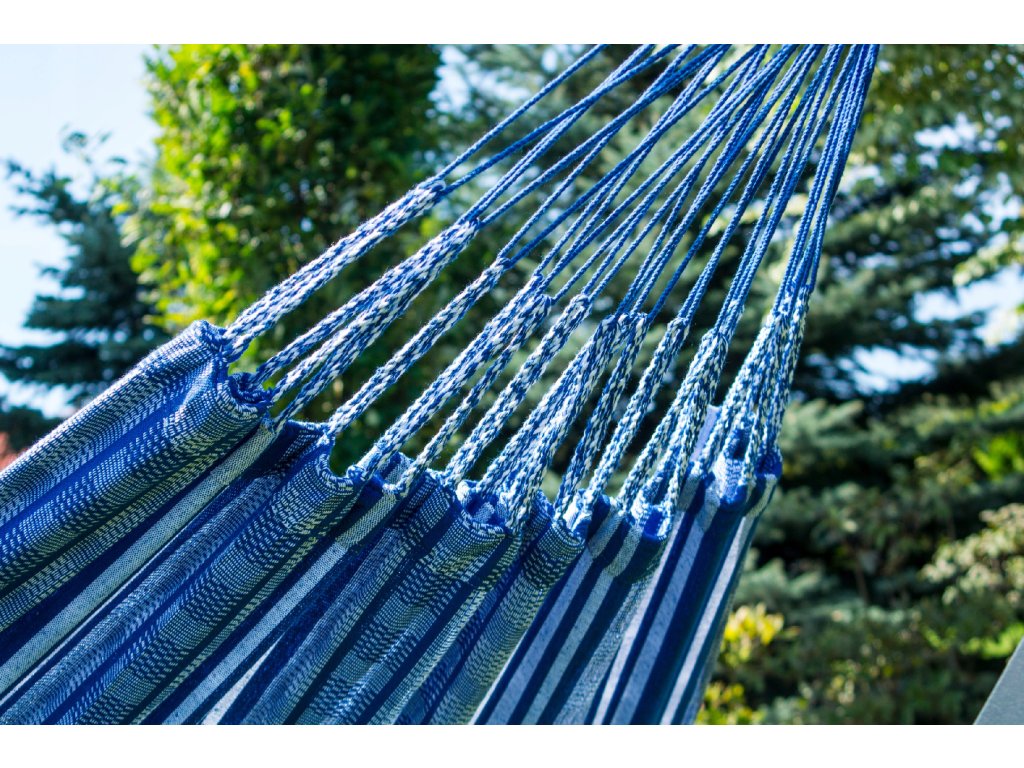 Brzegi materiałów są fabrycznie zakończone oraz wzmocnione podwójną gęstością splotu podwyższając tym samym znacząco wytrzymałość hamaka.