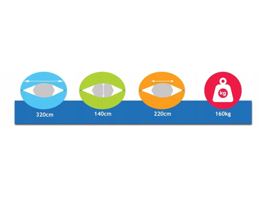 (długość całkowita hamaka, szerokość materiału, długość całkowita materiału, maksymalna nośność)