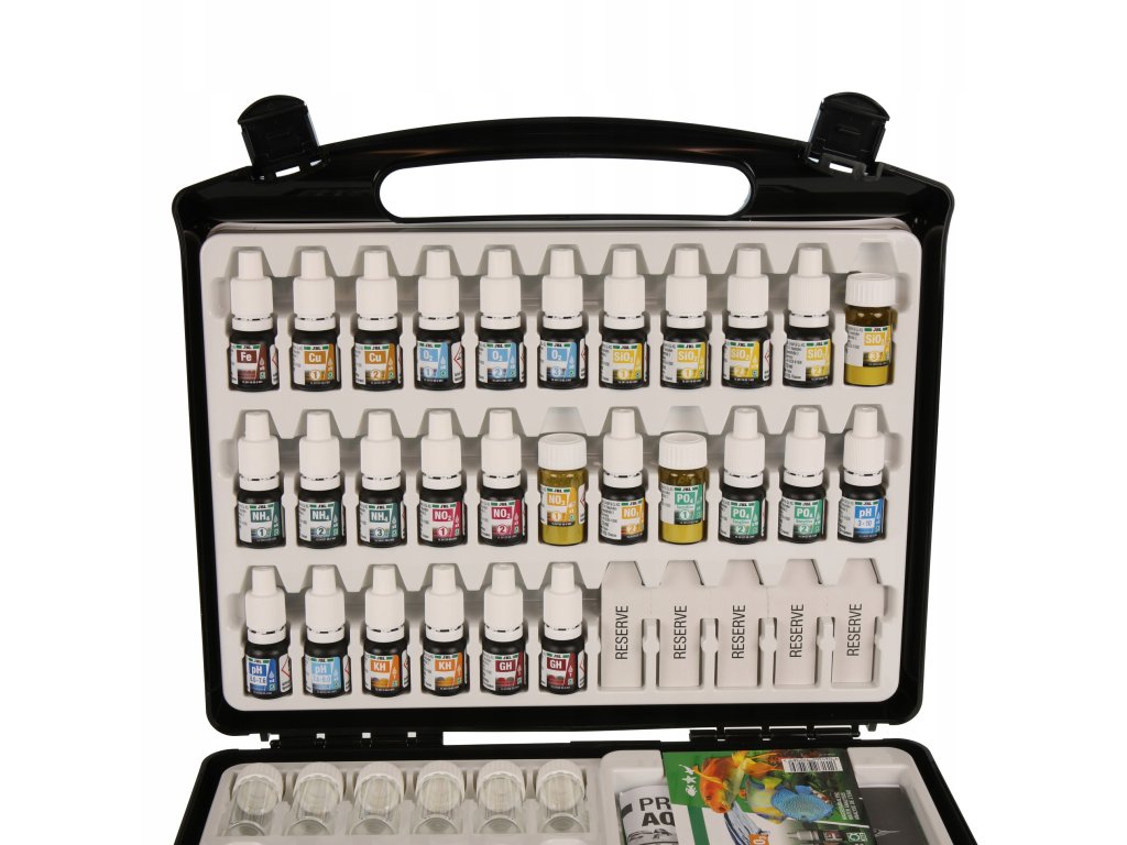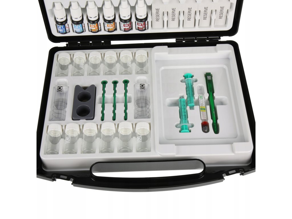 Táto súprava umožňuje presné meranie najdôležitejších hodnôt, ako sú hodnoty pH, tvrdosť uhličitanu, celková tvrdosť, fosfáty, dusitany, dusičnany, železo, kremičitany a amoniak / amoniak.