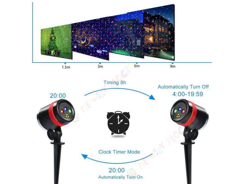 Bardzo dobre parametry zapewniają intensywną iluminację, a trwałość gwarantują atesty na działanie w zakresie temperatur od -25 do + 40 stopni Celsjusza i wysoka odporność na zawilgocenie (IP65). Można wybrać oświetlenie jedną barwą (zielone, czerwone, niebieskie) lub trzema jednocześnie. Można ustawić częstotliwość, z jaką wzory będą się zmieniać oraz czas, po jakim projektor się wyłączy – 2, 4 lub 8 godzin.