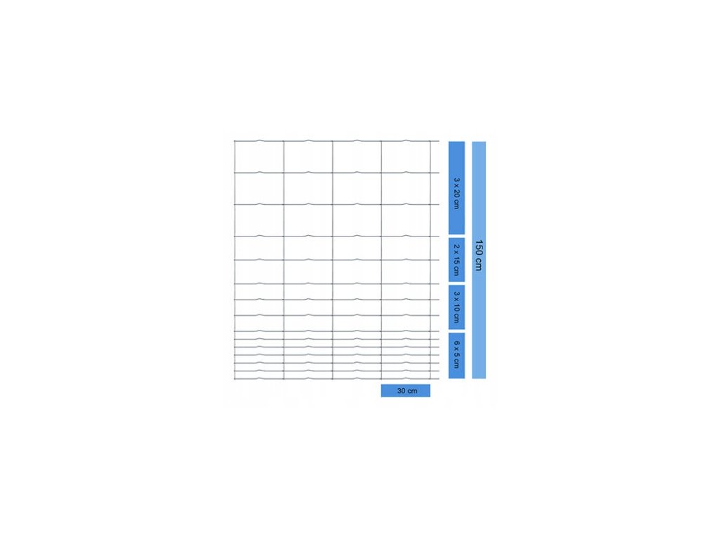 • horizontálna rozteč drôtov - 6 x 5 cm + 3 x 10 cm + 2 x 15 cm + 3 x 20 cm