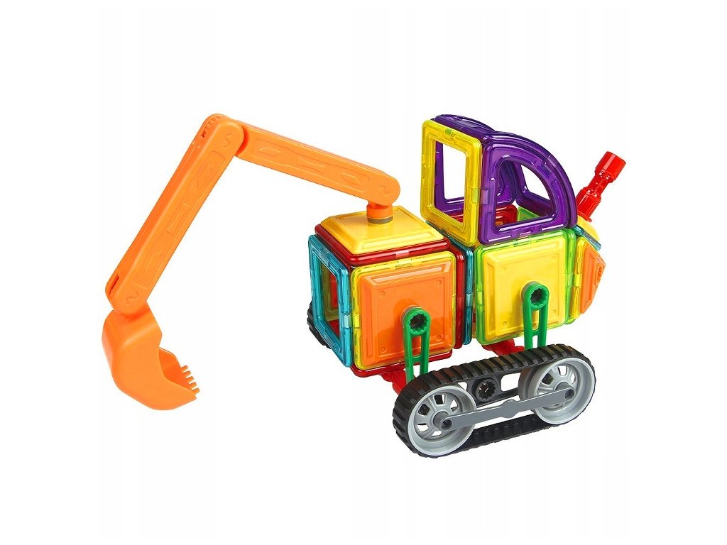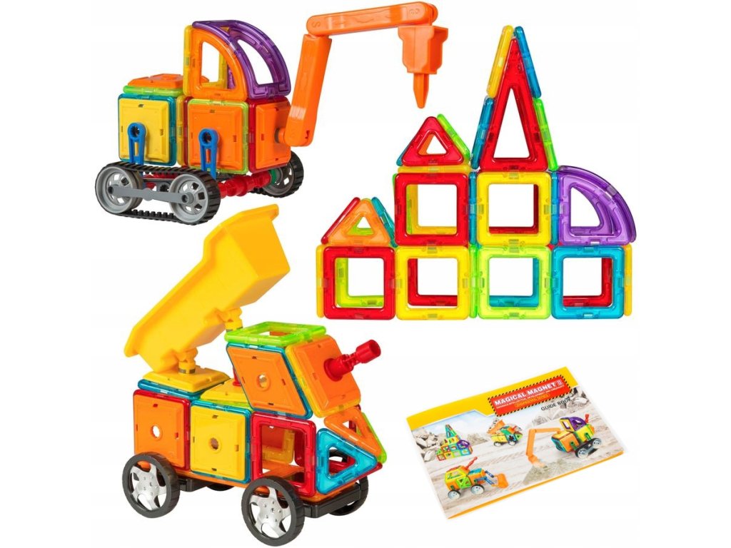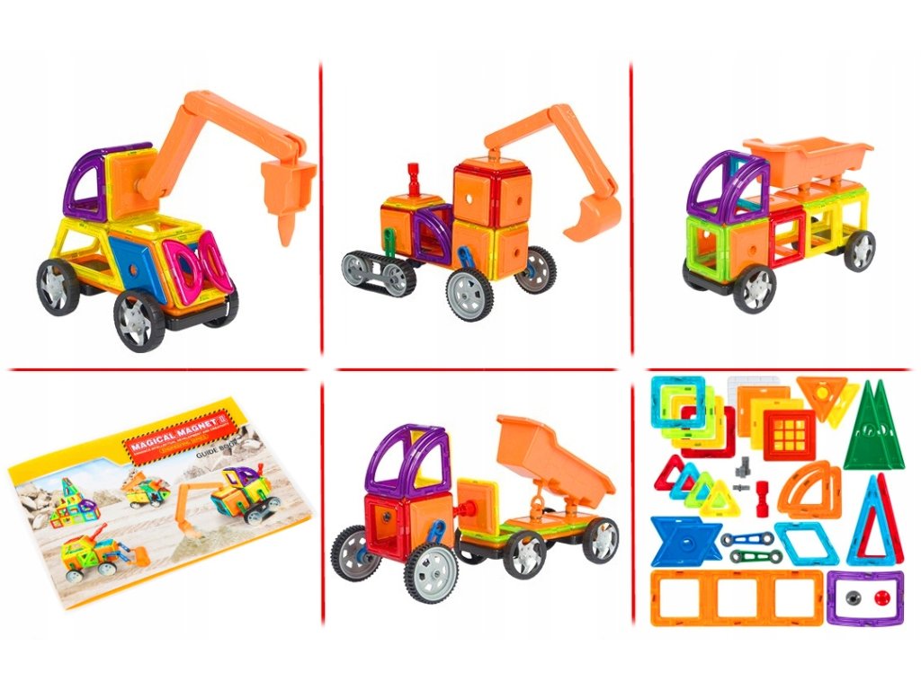 Oferowany GIGANTYCZNY zestaw klocków magnetycznych posiada w zestawie ilustrowaną książeczkę z wyszczególnieniem wszystkich elementów oraz z przykładami jak budować figury przestrzenne 3D oraz przeróżne maszyny budowlane !