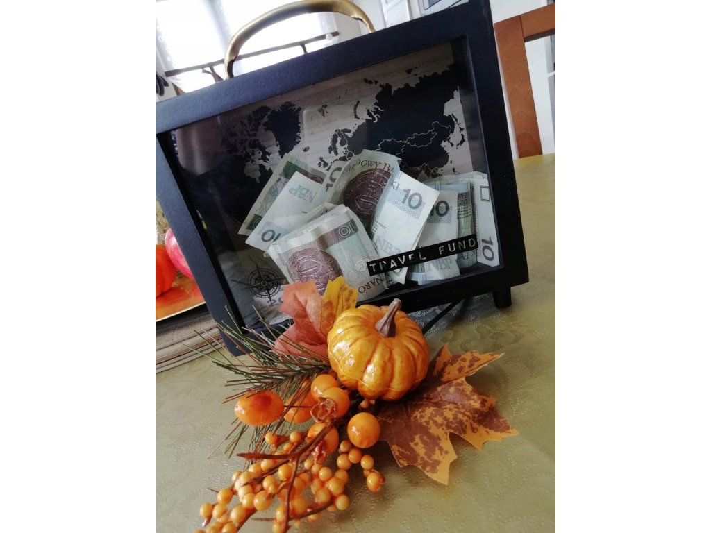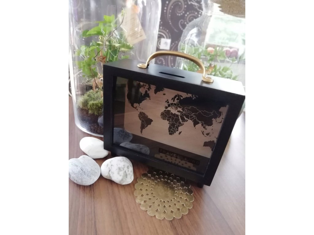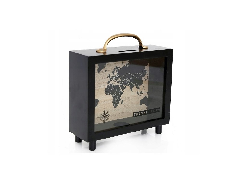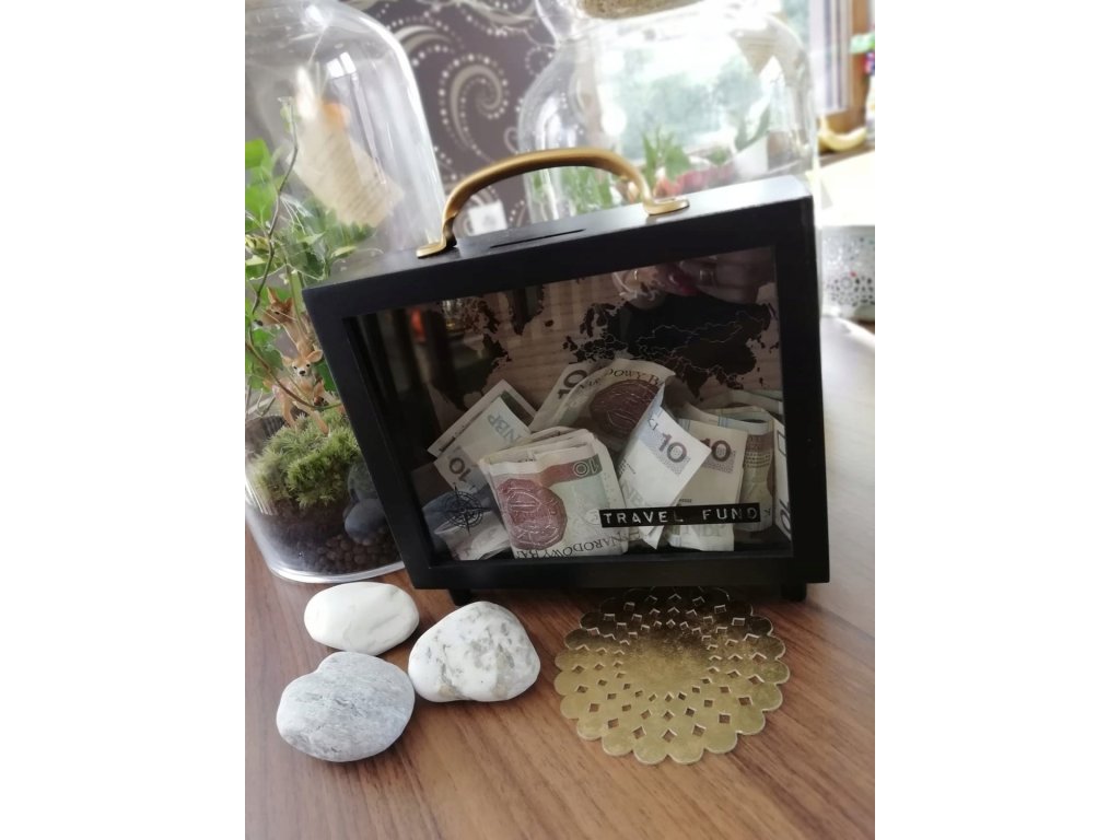 Szukasz niesamowitego pomysłu na prezent dla najbliższej ci osoby? To dobrze trafiłeś! Wysokiej jakości oryginalna oraz pomysłowa skarbonka "TRAVEL FUND" o kolorze czarnym ze złotą rączką. U góry znajdziemy otwór, dzięki któremy możemy wrzucać monety oraz banknoty. Z przodu ładna przejrzysta szybka. By wyjąć monety wystarczy skorzystać z dolnego otworu. (Aukcja dotyczy samej skarbonki, brak banknotów w zestawie)
