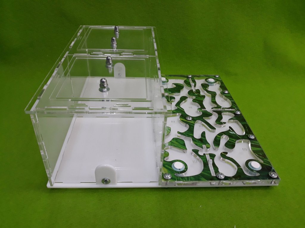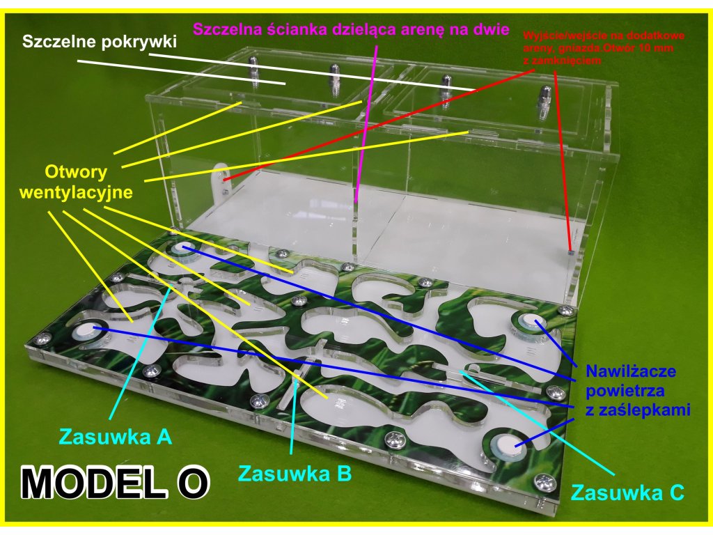 Formárium je vyrobené z akrylu. Arény a hniezdo majú potrebné vetracie otvory. V chove