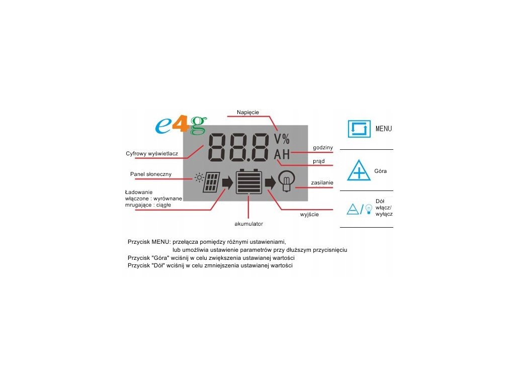Na wyświetlaczu regulatora można obserwować bieżące napięcie ładowania akumulatorów oraz ustawić/wybrać tryb pracy z akumulatorami żelowymi, kwasowymi i AGM jak również ręcznie zaprogramować nastawy napięć i czasu załączania wyjścia.