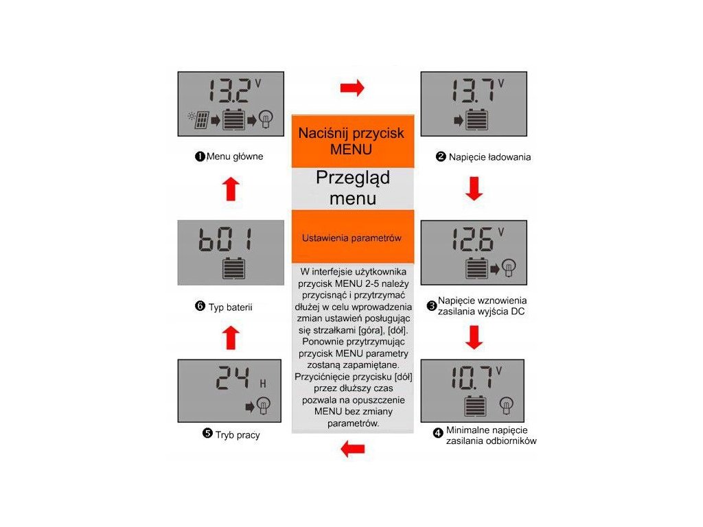 Wybierając przycisk funkcyjny można wywołać wybrany parametr i zmodyfikować go za pomocą przycisków strzałek oraz zatwierdzić. Możliwe do zmiany są typy akumulatora, napięcie ładowania i rozładowania oraz czas załączania zasilania podłączonego odbiornika po zmroku.
