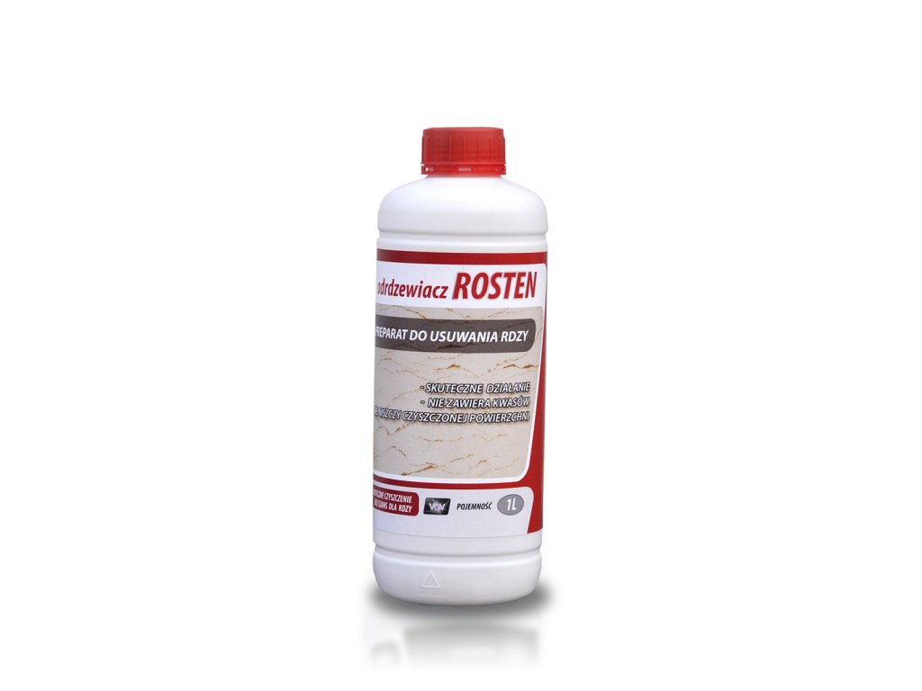 Odrdzewiacz ROSTEN jest nowoczesnym rozwiązaniem przy czyszczeniu i usuwaniu rdzy oraz rdzawym przebarwień. Preparat jest w postaci bezbarwnego płynu, który poprzez nałożenie w miejsce zardzewiałe pochłania ją nie niszcząc czyszczonej powierzchni co odróżnia go od innych preparatów tego typu. Preparat nie zawiera kwasów. Jest mocno wonnym preparatem, zaleca się go do stosowania na zewnątrz.