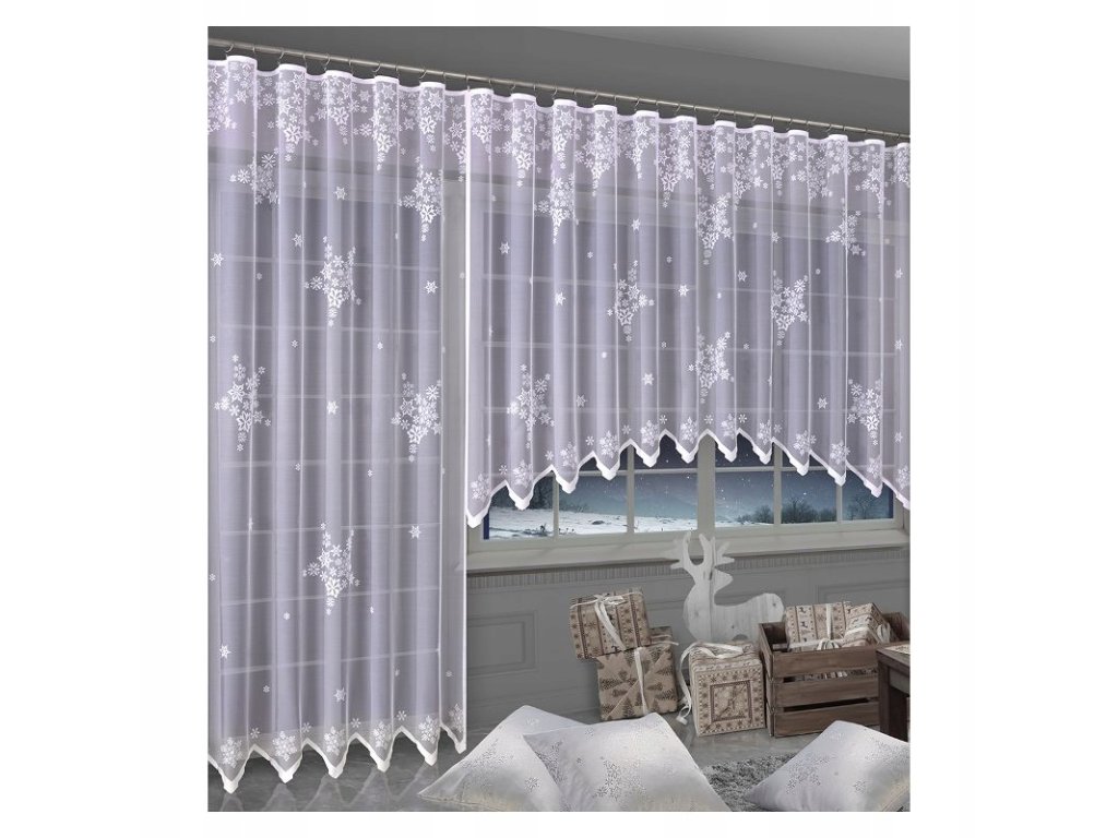 Świąteczna firanka Śnieżki dostępna jest w sprzedaży w wersji gotowej w rozmiarach 300 x 160 cm i 180 x 250 cm