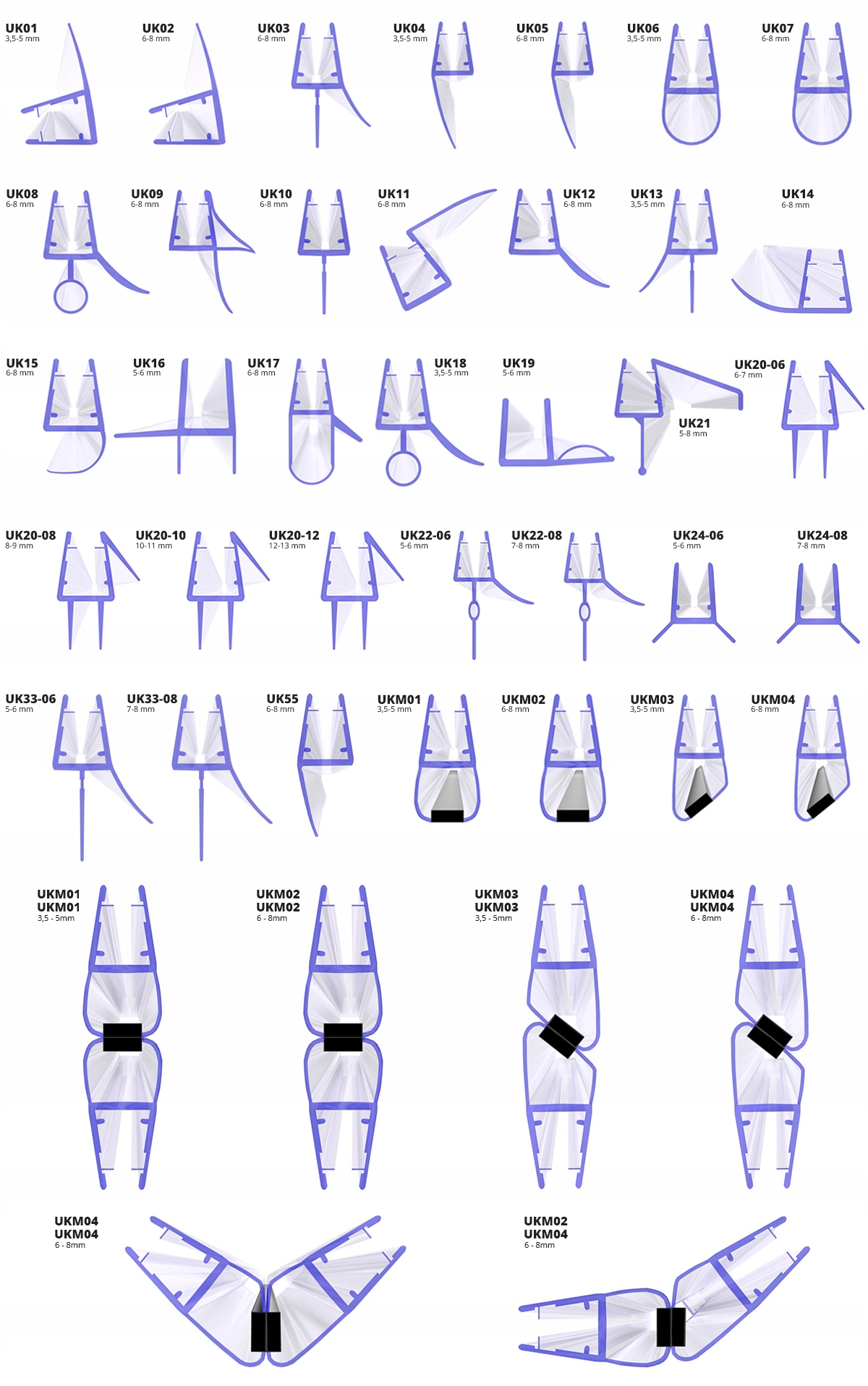 Väčšina modelov tesnení je k dispozícii aj v ohnutej verzii pre polkruhové kabíny. Magnetické tesnenia UKM pre dvere sprchových kútov sú dostupné len v dĺžke 200 cm.