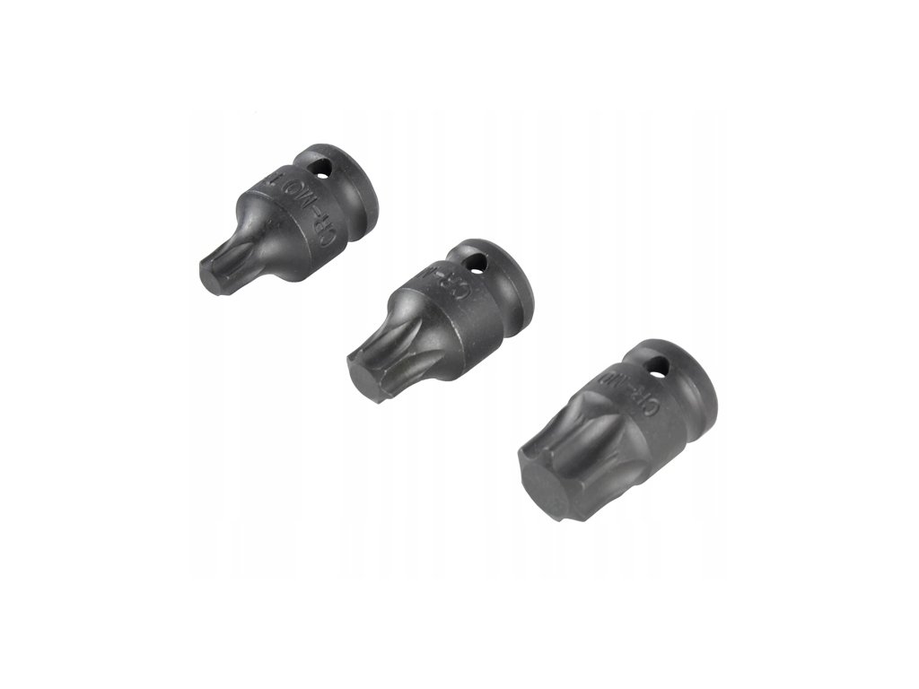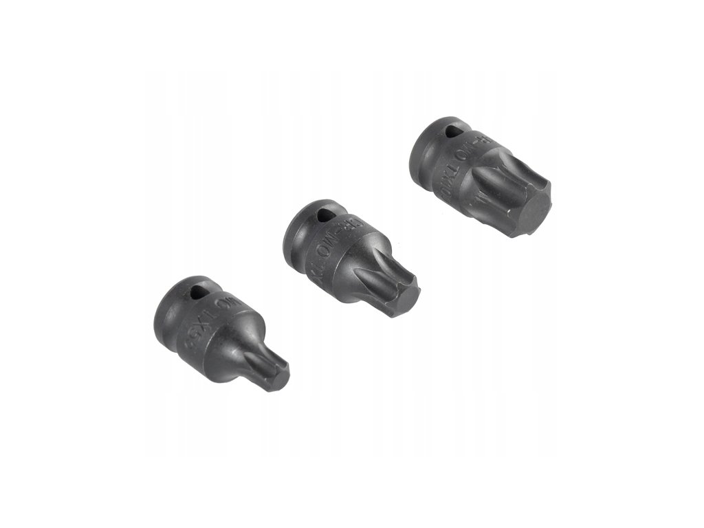 Zestaw kluczy udarowych torx na 1/2" wykonanych ze stali chromowo-molibdenowej.