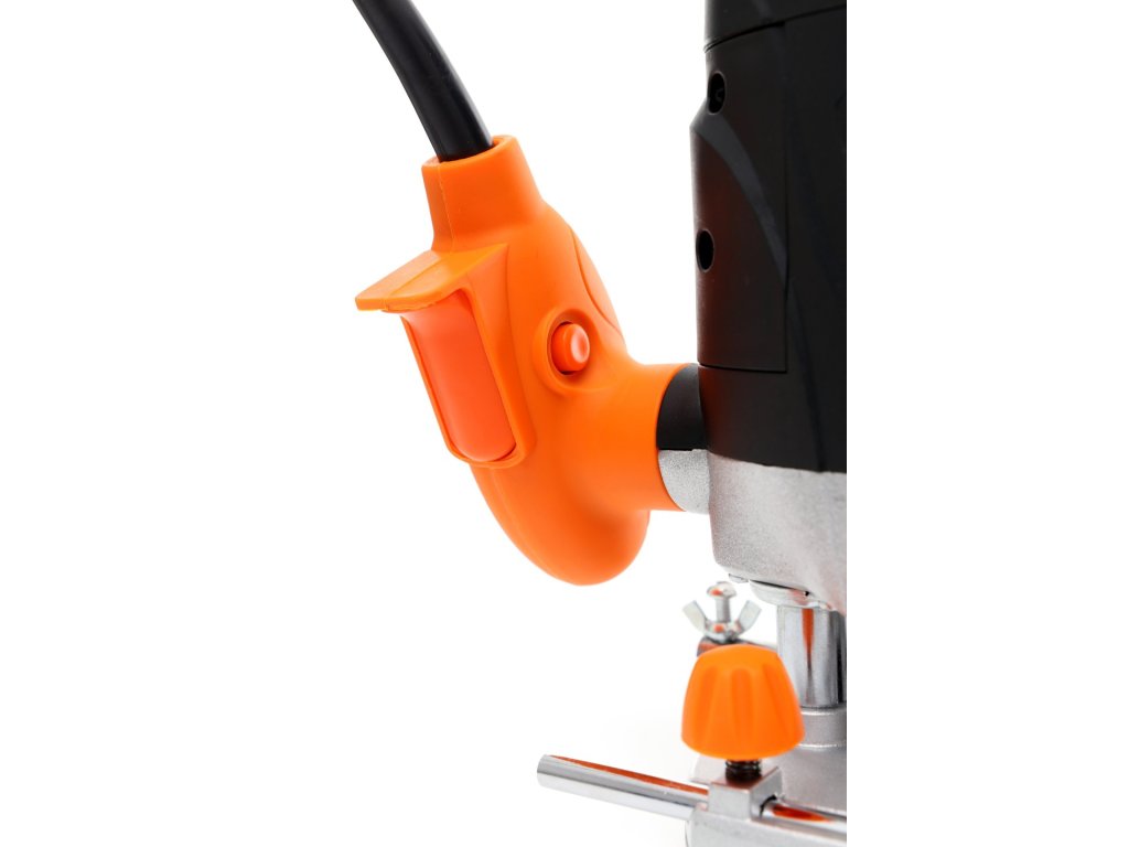 Blokada spustu - aby uruchomić frezarke, wystarczy nacisnąć spust umieszczony na rękojeści. Dodatkowy przycisk blokady pozwala na swobodne puszczenie spustu oraz ciągłą pracę urządzenia