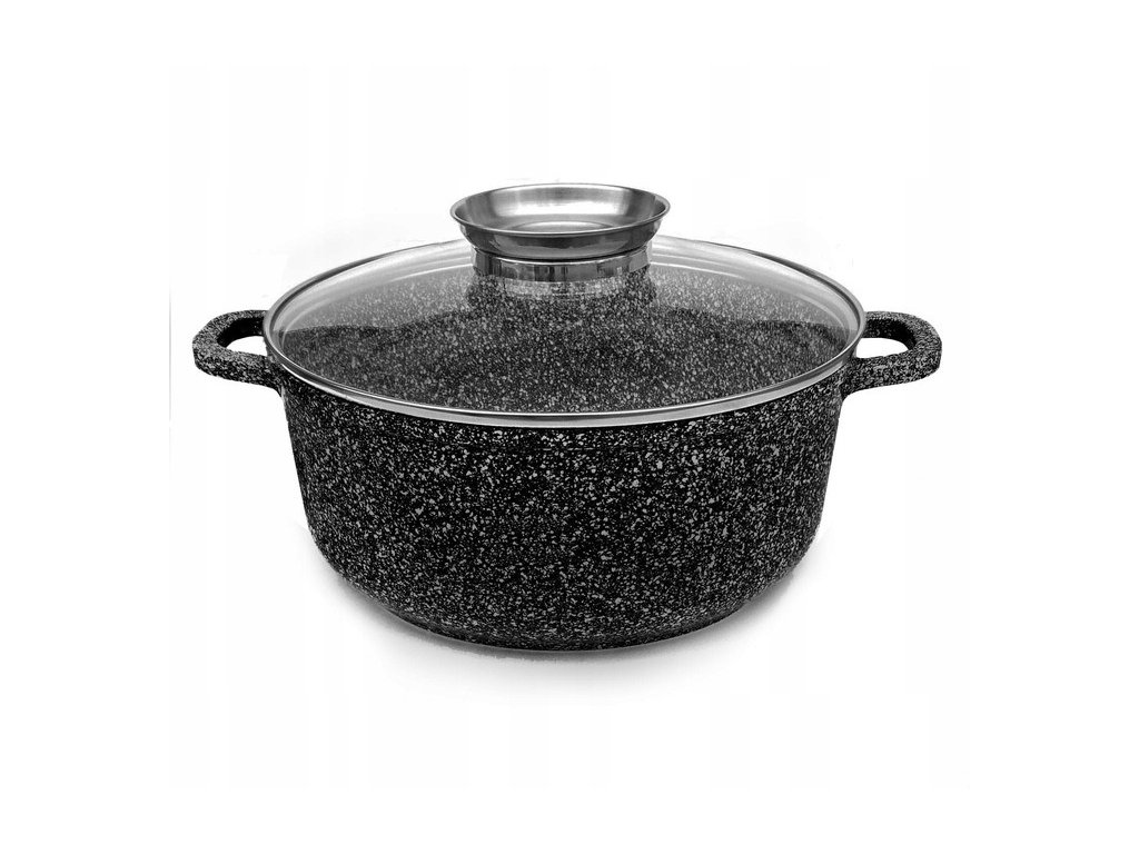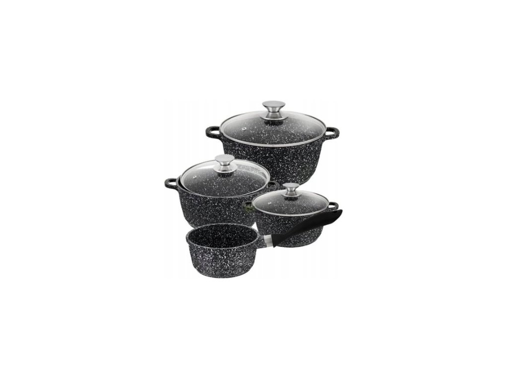 Sada 6 hrncov EDEL HOFF s nepriľnavým keramickým mramorovým povrchom. Súprava má sklenené pokrievky s rukoväťou Aroma Knob, v ktorej je dávkovač oleja, vďaka ktorému môžete dávkovať olej alebo tekuté korenie pri varení alebo dusení. Hrnce vyrobené z hliníkovej zliatiny majú indukčné feromagnetické dno. Sú navrhnuté tak, aby fungovali s akýmkoľvek typom sporáka vrátane indukcie.