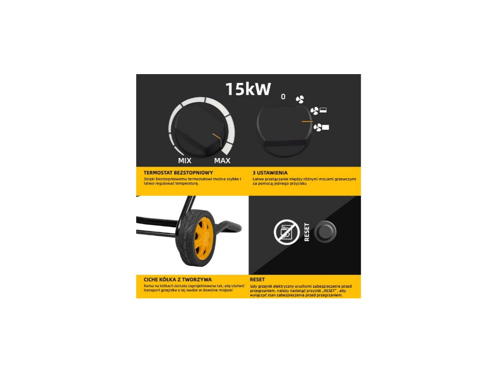 Tento 15kW priemyselný ohrievač je ideálnym riešením na efektívne vykurovanie veľkých priestorov a drsného prostredia. Navrhnutý pre výkon a bezpečnosť, kombinuje silný výkon s dlhotrvajúcou odolnosťou.
