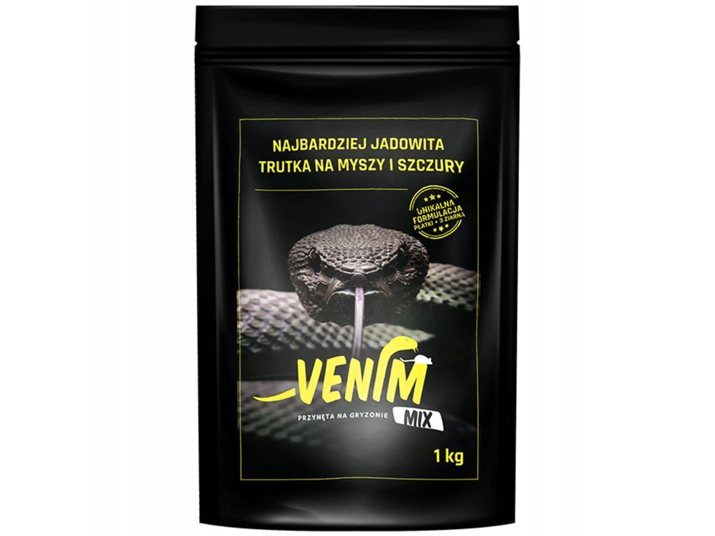 VENIM MIX to gotowa do użycia, wysokiej jakości mieszanina 3 rodzajów ziarna (kukurydzy, dwóch rodzajów słonecznika) oraz płatków owsianych. Zawiera składnik zapobiegający przypadkowemu spożyciu przez zwierzęta nie będące przedmiotem zwalczania. VENIM MIX zawiera substancję czynną DIFETIALON w stężeniu 0,0025%, która jest aktualnie najsilniejszą substancją czynną dostępna zarówno dla użytkowników powszechnych, jak i dla użytkowników profesjonalnych i profesjonalnych przeszkolonych.