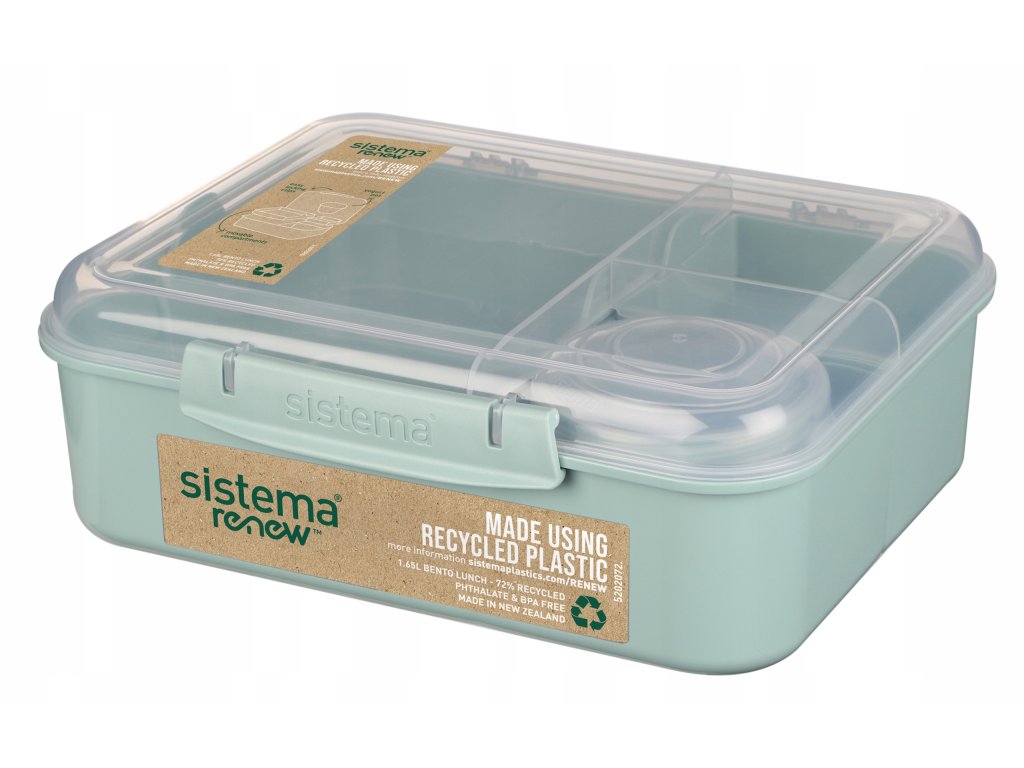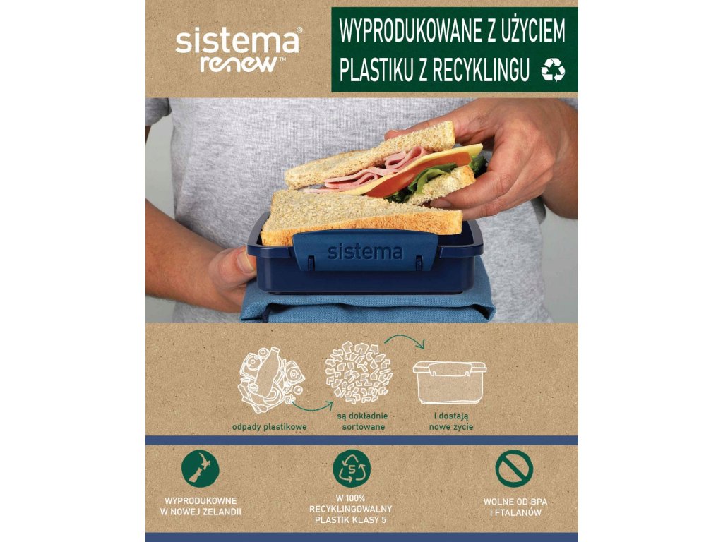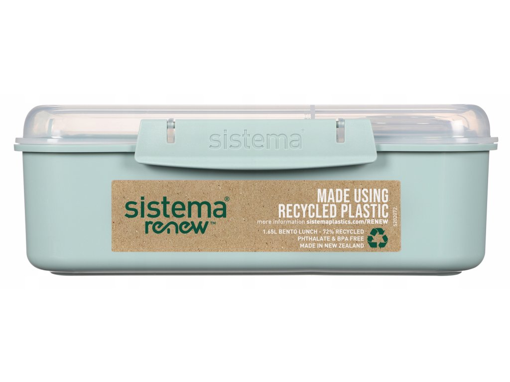Sistema® Renew ™ to seria produktów wielokrotnego użytku, które są wykonane przy użyciu procentu plastiku pochodzącego z recyklingu. Celem firmy Sistema w serii Renew ™ jest wykorzystanie minimum 30% plastiku pochodzącego z recyklingu, który jest połączeniem materiału pochodzącego z recyklingu po-użytkowego i materiału poprzemysłowego.