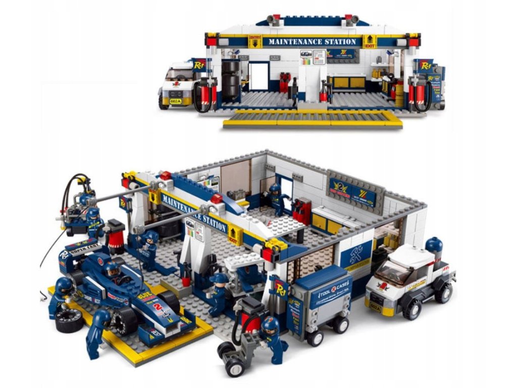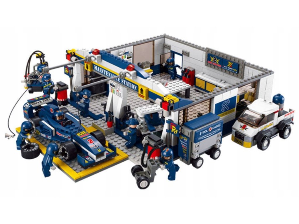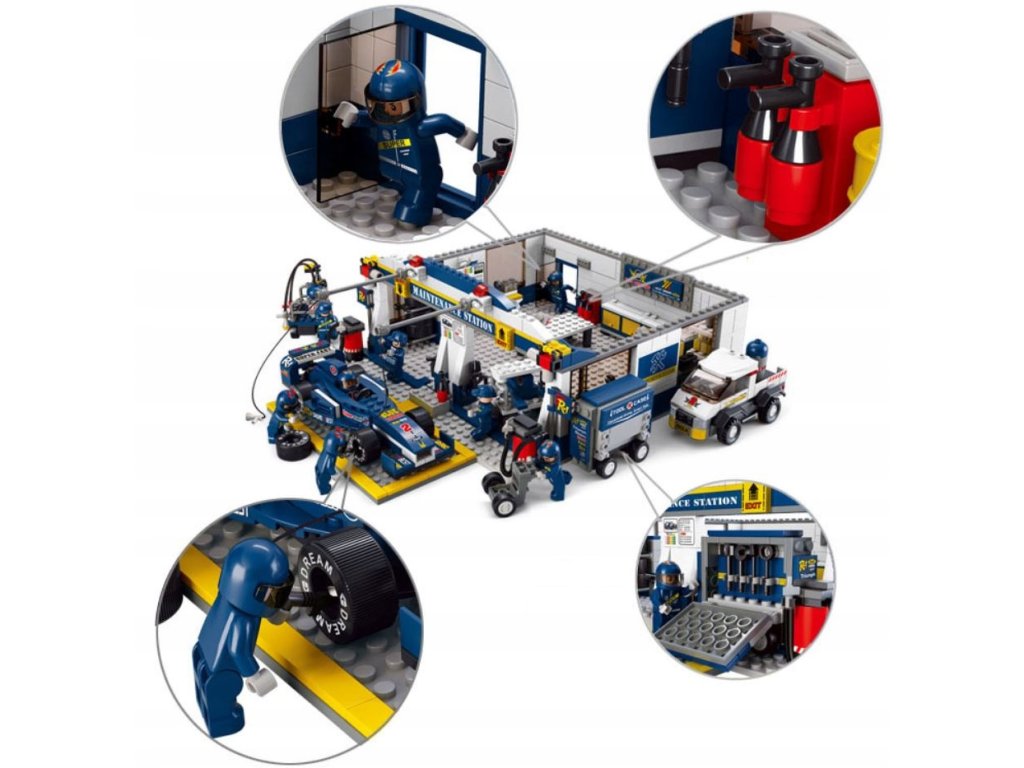 Zestaw PIT-STOP FORMUŁA 1  + BOLID + OBSŁUGA składa się z 741 elementów w postaci klocków i figurek, jest on kompatybilny z innymi markami klocków (LEGO; COBI; KAZI; BLOCKI; LEUI i wiele innych)