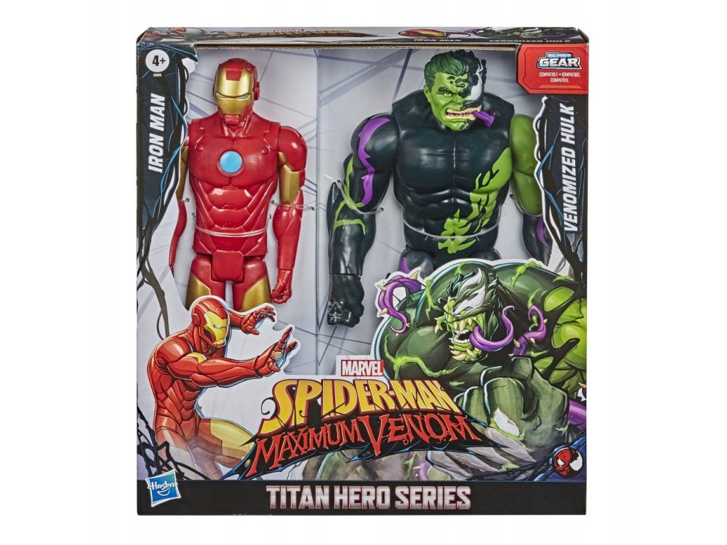 Hasbro Spider-Man Maximum Venom - Figurka 30 cm Titan Hero 2-Pak Iron Man i Hulk Venom E8685. Przenieś się do świata filmu i odgrywaj niesamowite przygody bohaterów. Zestaw zawiera wiernie odwzorowaną figurkę Iron Mana i Hulka przeobrażającego się w Venoma.