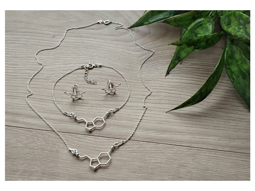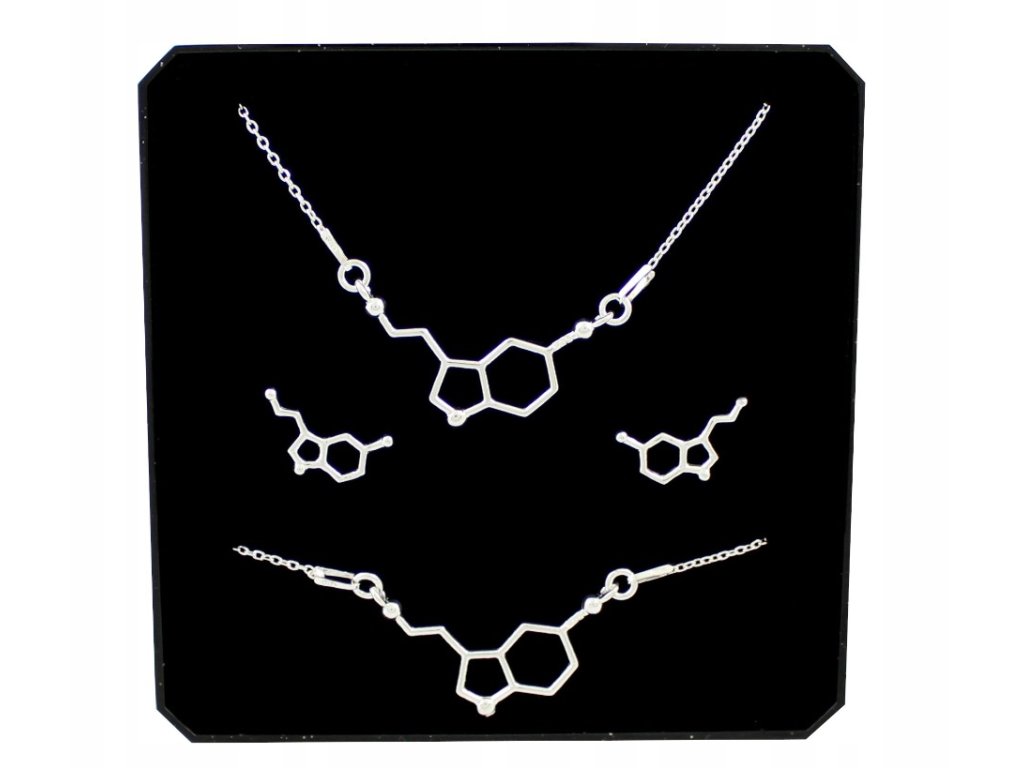 Súprava strieborných šperkov so serotonínovým motívom je mimoriadna súprava, ktorá spája eleganciu striebra s trochou vedy a jedinečným posolstvom. Nielenže je tento šperk krásnym doplnkom vášho šatníka, ale predstavuje aj váš záujem o vedu a lásku k chemickým tajomstvám serotonínu, známeho ako "hormón šťastia".