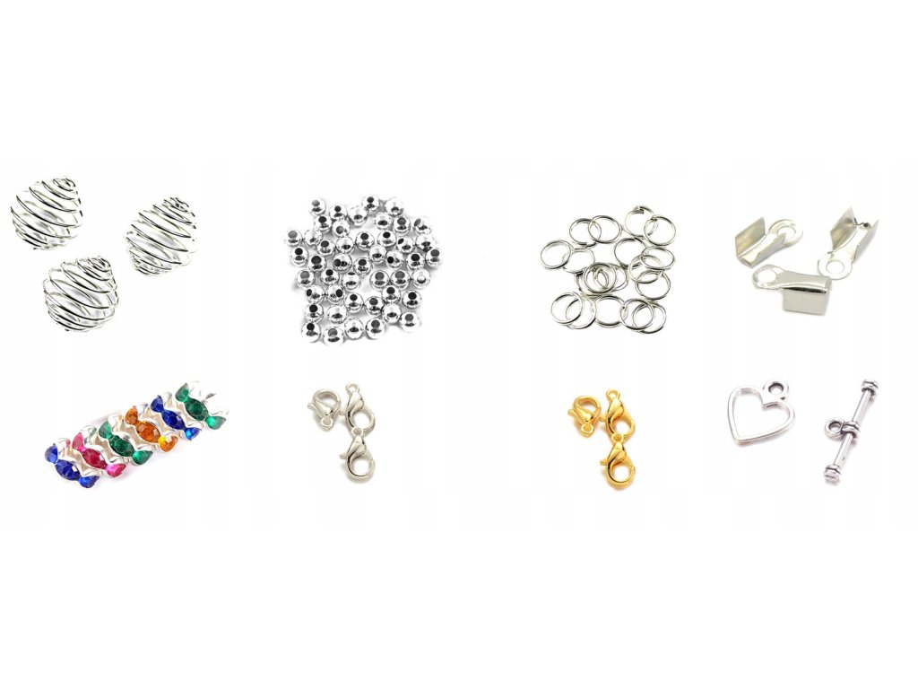 Prezentowany zestaw zawiera dwa organizery wypełnione koralikami. W skład zestawu dołączonych jest 10 sznurków w różnych kolorach, 5 rzemieni plecionych do bransoletek oraz rozciągliwa gumka silikonowa na szpulce, dodatkowo do zestawu dołączone są duże koraliki drewniane oraz elementy montażowe i ozdobne.