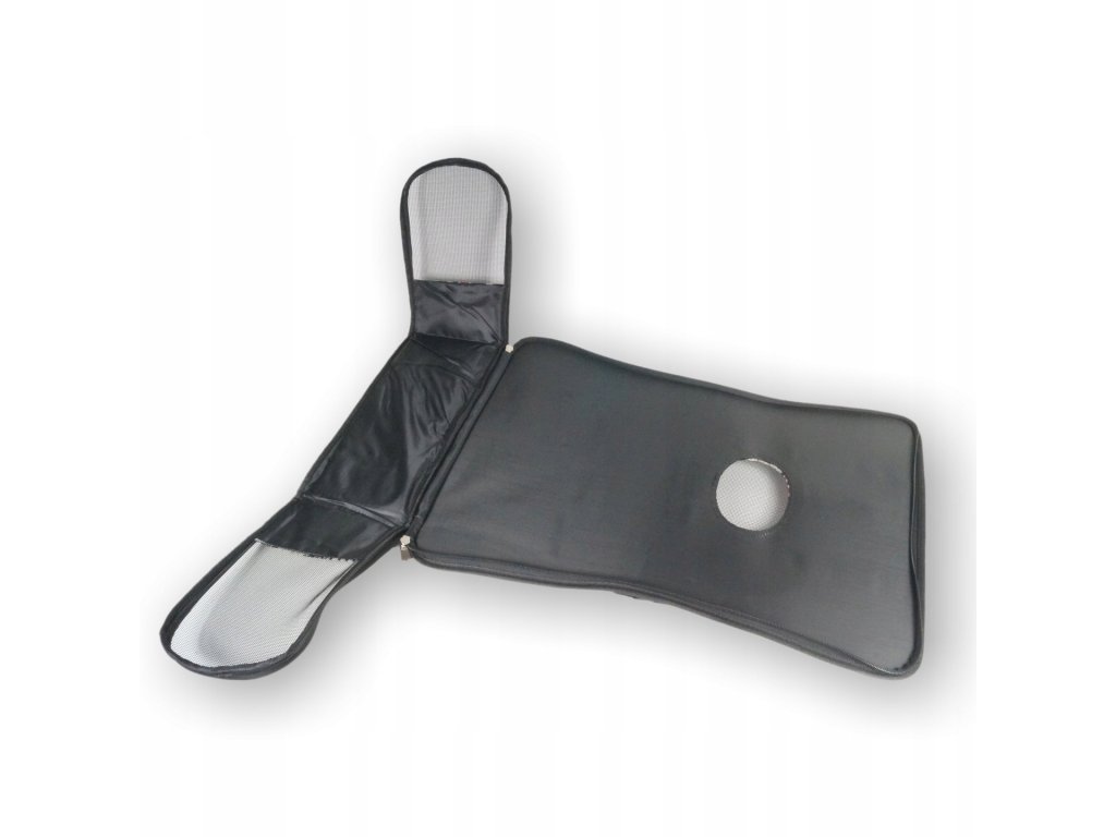 Od spodu torby znajdują się małe nóżki, wewnątrz transportera wymienna mata.