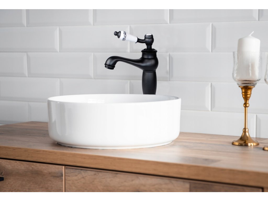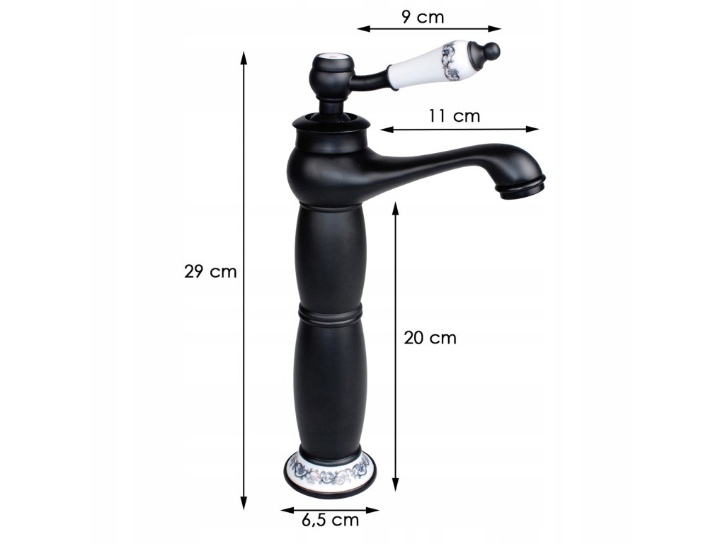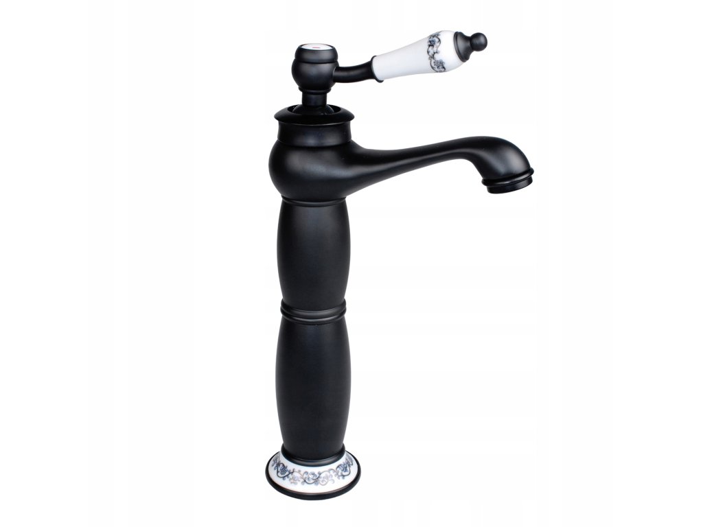 Wysoka, mechaniczna bateria umywalkowa, wolnostojąca, jednouchwytowa w stylu retro / vintage. Kolor baterii to czarny mat, elementy dekoracyjne wykonane ze zdobionej ceramiki. Zarówno 35 mm głowica ceramiczna jak i perlator oszczędzają nawet do 40% wody. Zestaw zawiera 2 wysokiej jakości wężyki w oplocie ze stali nierdzewnej o długości 40 cm ze standardowym przyłączem 3/8 cala oraz komplet akcesoriów do montażu baterii. Design baterii został podporządkowany trendom na rok 2020 - prezentuje się niezwykle elegancko i idealnie pasuje do łazienki urządzonej w stylu retro.