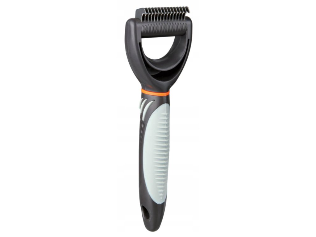 Univerzálny hrebeň pre starostlivosť o vnútornú a vonkajšiu vrstvu vlasov. Stredné zuby dlhé 1 cm. Má praktickú plastovú rukoväť s gumovou / kovovou rukoväťou. Jemne vystrihne zamotané chlpy vášho domáceho maznáčika.