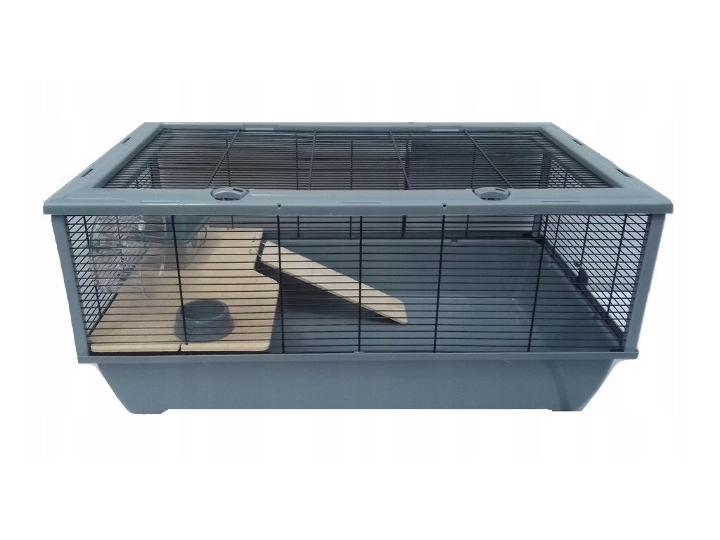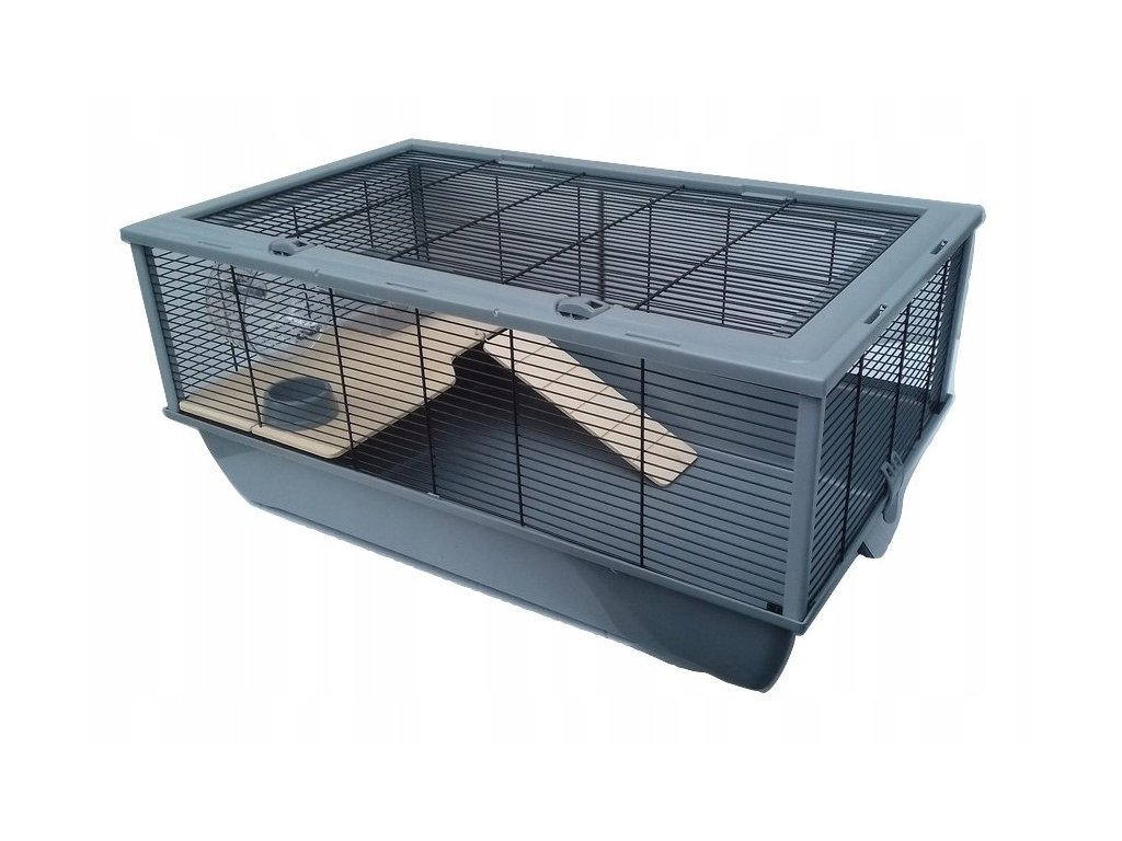 Klatka z kuwetą i ramkami w kolorze szarym i czarnymi drutami.