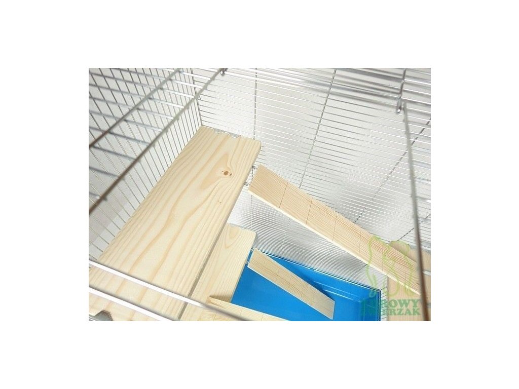 Wyposażenie klatki dostosowane jest do każdego z ww. gatunków gryzoni. Półki wykonane są z drewna liściastego - topoli lub brzozy, to gatunki drzewa przyjazne dla fretki i bezpieczne dla wszystkich gryzoni, zarówno dla szynszyli jak i wiewiórki, szczura lub koszatniczki. Mocne półki (z litego drewna, niepokryte żadnym impregnatem) posiadają bardzo stabilne, stalowe mocowanie do ścian klatki. Półki dzięki swej grubości (ok.2 cm) nie dają się szybko "ogryźć", dzięki czemu długo służą jako stabilne miejsce do wypoczynku oraz szalonych zabaw. Pomiędzy półkami znajdują się drewniane drabinki, które można zamontować w dowolnym miejscu półki. Drabinki będą bardzo pomocne dla np. burunduków, które nie radzą sobie ze skakaniem tak dobrze jak np. szynszyle.