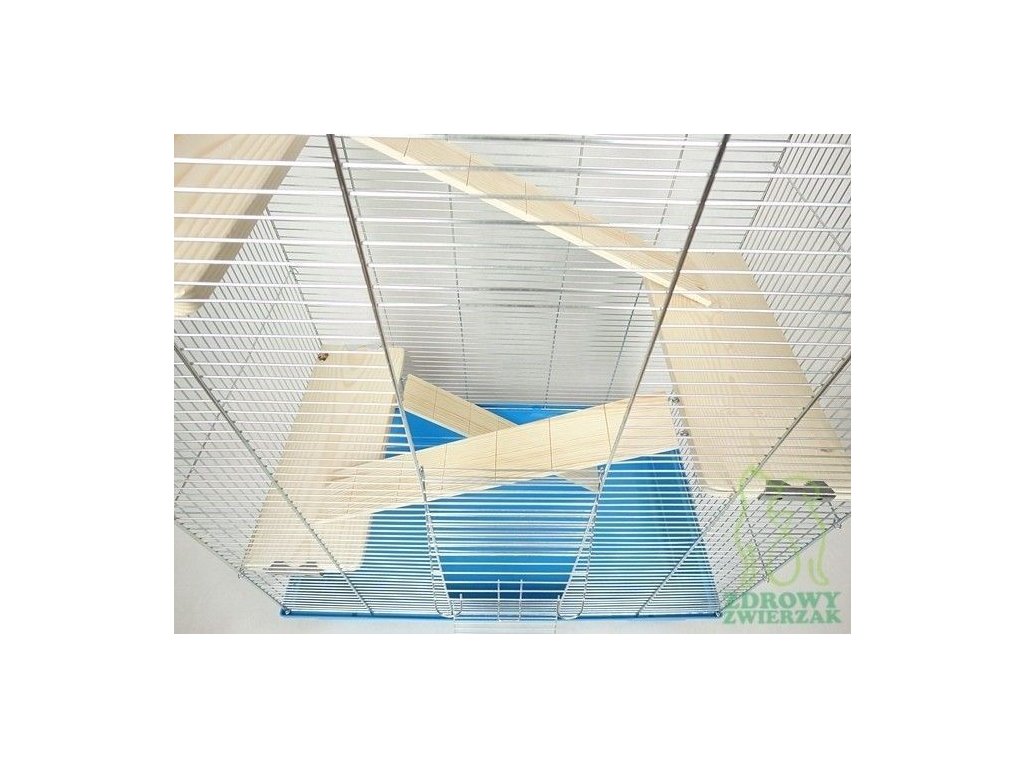 Duża klatka dla gryzoni z wyposażeniem z drewna liściastego.